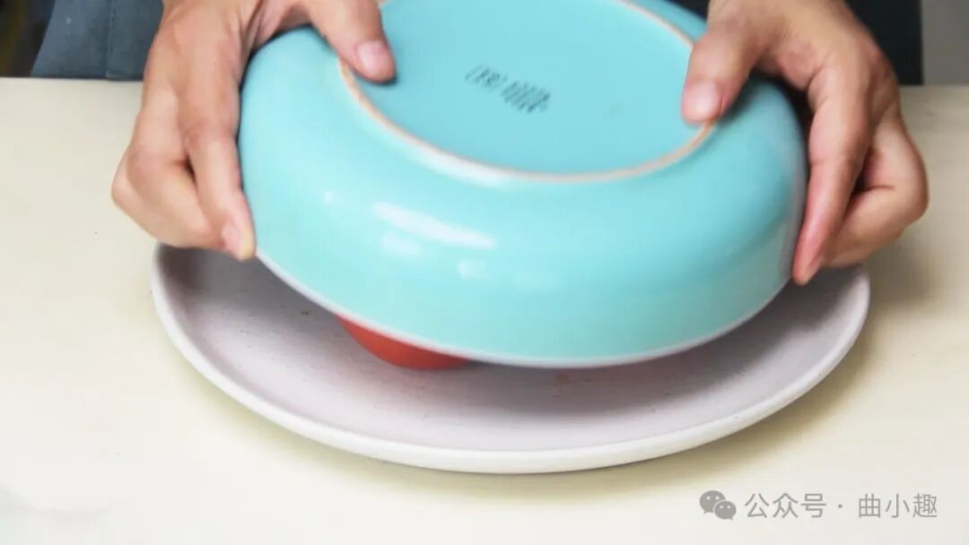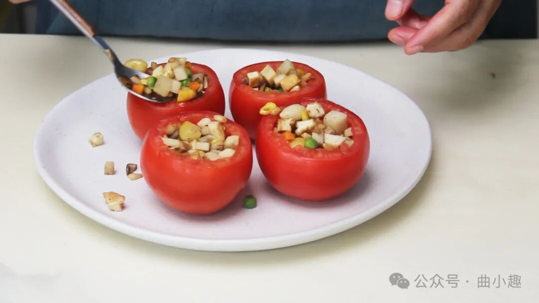 撒盐和白胡椒粉拌匀,将做好的馅料放入挖空的番茄中,然后用另一个盘子倒扣,将整个番茄翻转,入蒸锅蒸5-8分钟(不要蒸太久,否则番茄会裂)|Sprinkle with salt and white pepper powder and remove from heat. Place the cooked filling into the tomato cups, then take another plate to invert and flip the tomato cups upside down, and steam in a steamer for 5-8 minutes