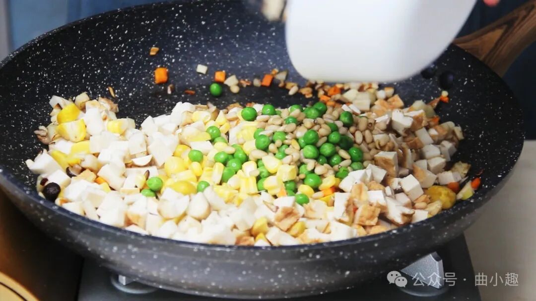 加入蒸好的花生以及板栗、豌豆、玉米粒和松仁,翻炒几分钟。如果太干,可以加入一到两汤匙水|Add steamed peanuts, chestnuts, green peas, corn kernels, and pine nuts, stir-fry for a few minutes. If it's too dry, you can add one or two tablespoons of water