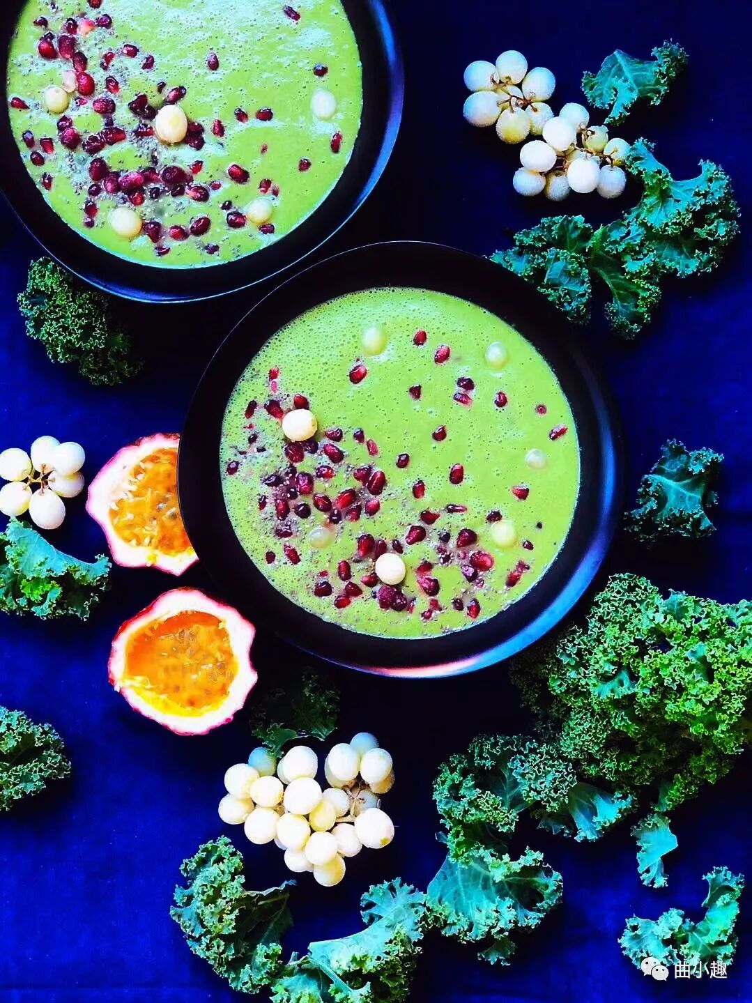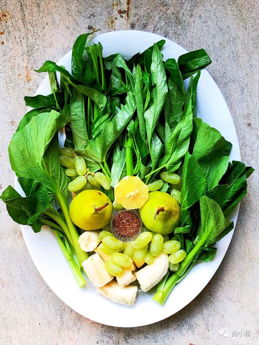 西兰花花梗、菜花花梗、羽衣甘蓝、青苹果、香蕉、柠檬、青葡萄、亚麻籽