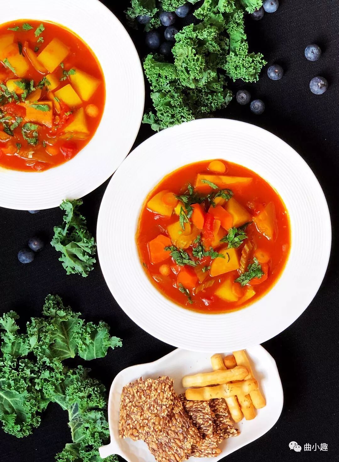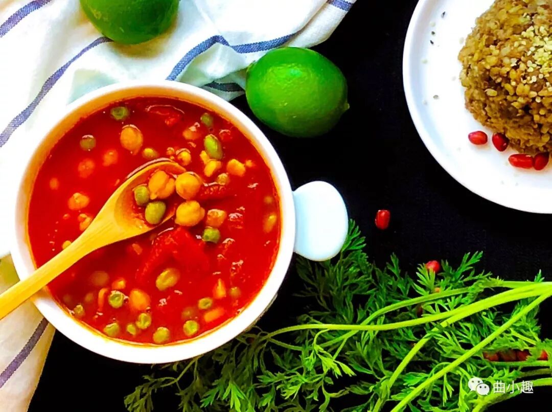 番茄2个切碎,放进锅中慢火煮出汤,再加入纯番茄酱、姜黄粉、熟鹰嘴豆、豌豆、毛豆、玉米粒、盐继续煮约5-10分钟即可。