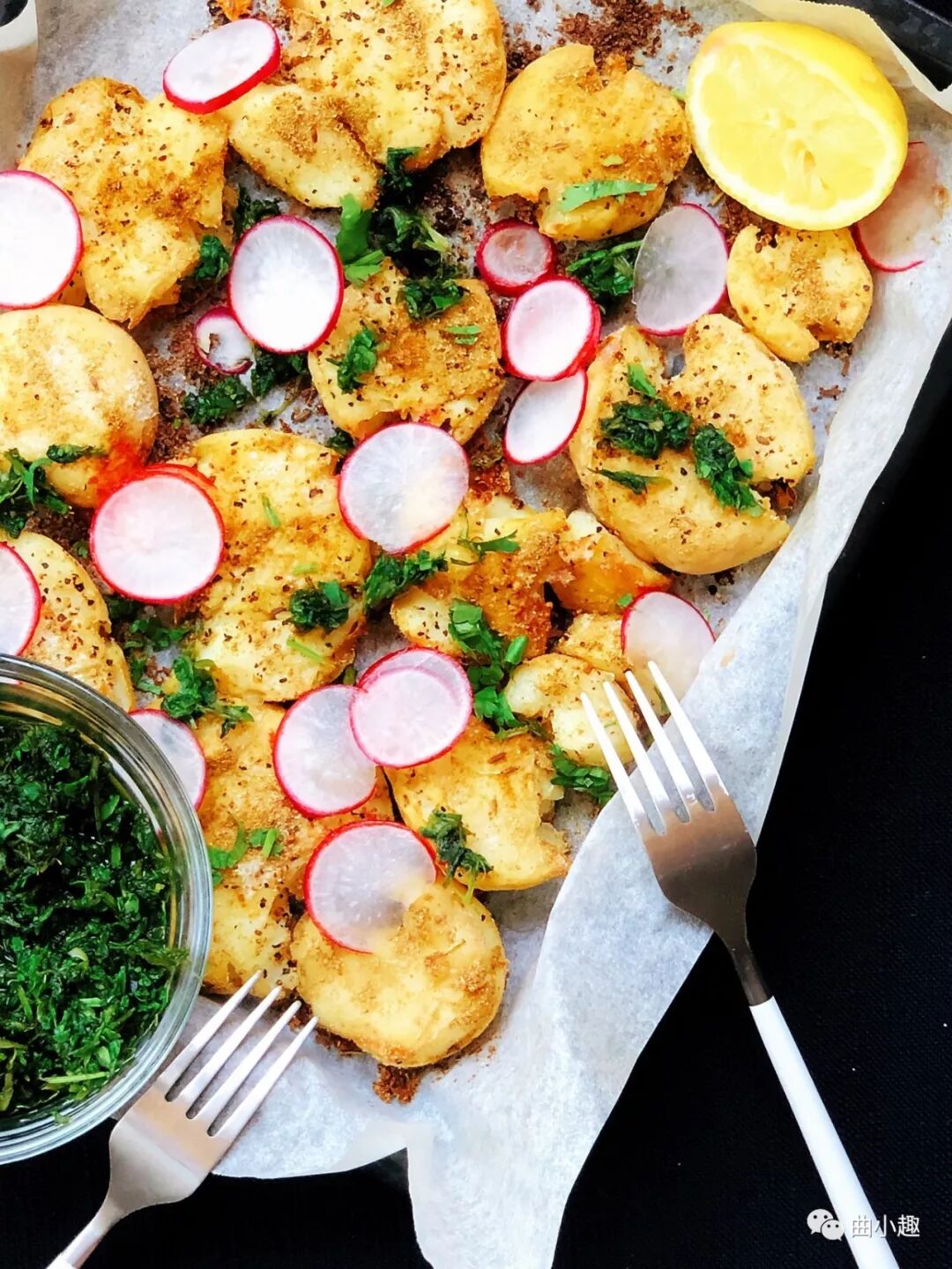 3,红薯丁翻动一下加入孢子甘蓝一起再烤10分钟左右取出,挤入柠檬汁、撒上百香草,与煮熟的腰豆一起拌着吃。