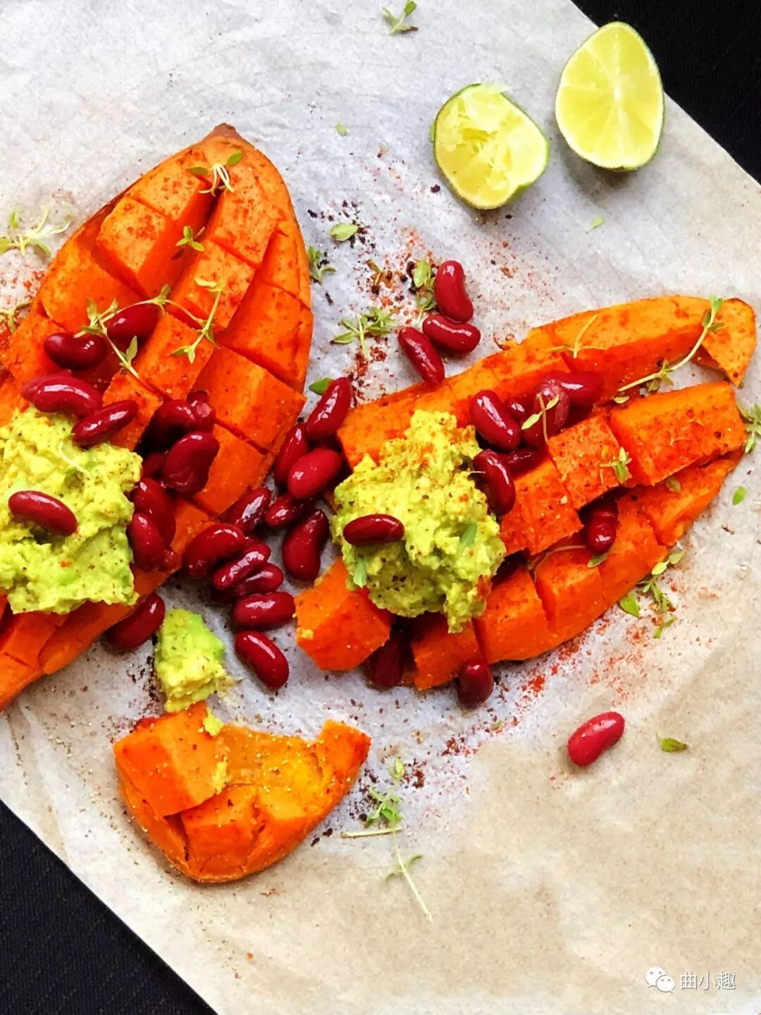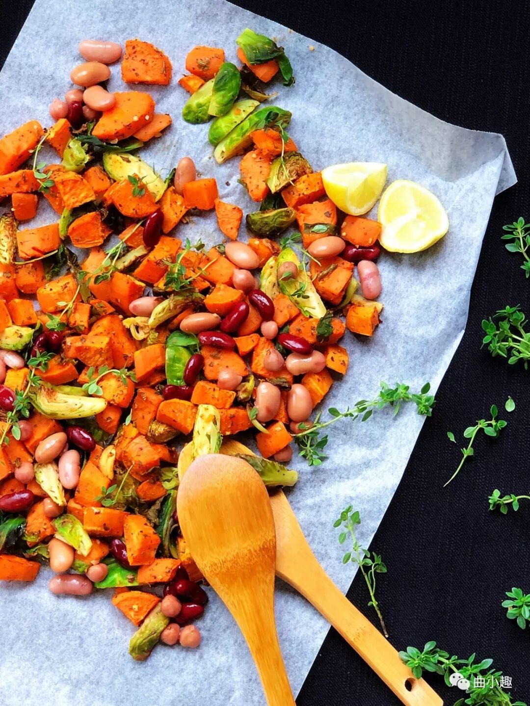 1,腰豆泡水过夜,煮熟。番薯切丁。孢子甘蓝对半切开,用盐、黑胡椒、孜然拌匀(怕苦可用水焯半分钟)。