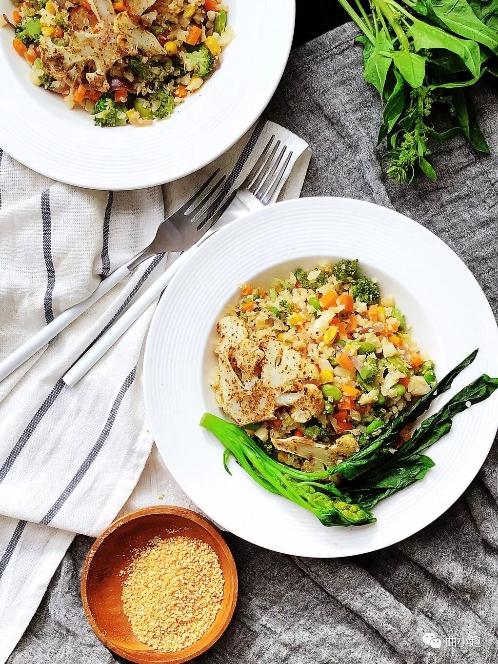 1,将白菜花用料理机打碎成假“米饭”。留出几片加孜然粉和盐用锅煎熟