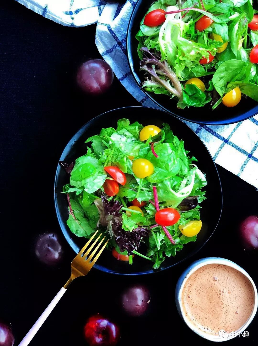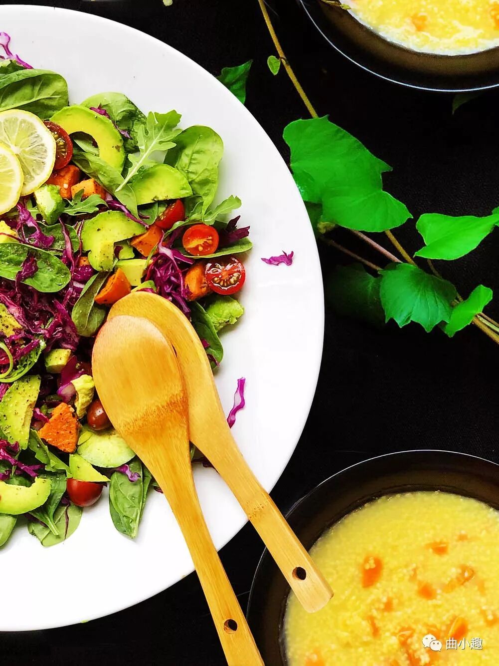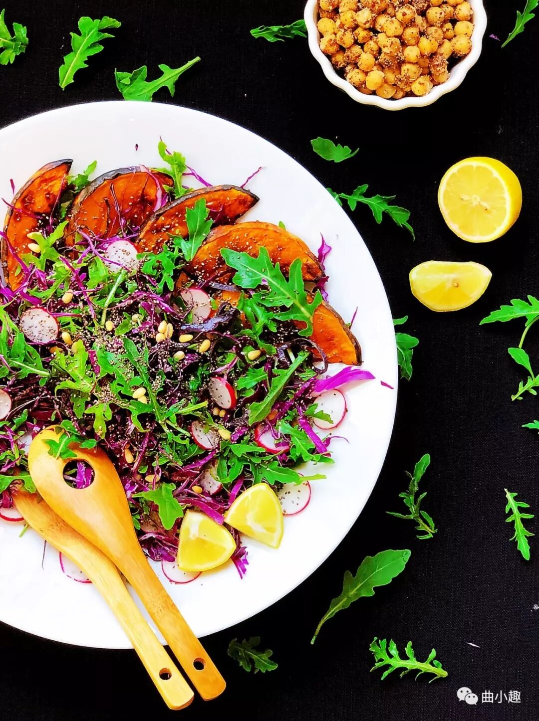 食材:紫甘蓝、牛油果、小菠菜、芝麻菜、小番茄、胡萝卜、柠檬、胡椒、盐
