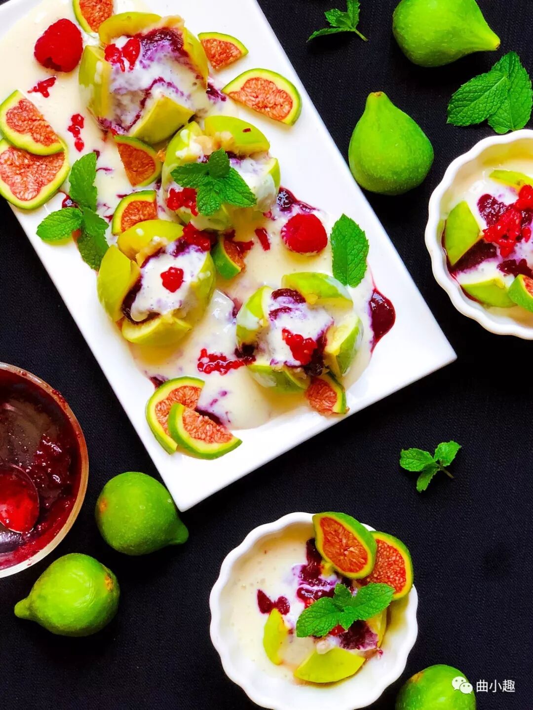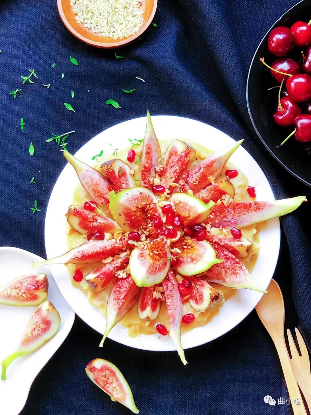 4,无花果切开十字,先挖一勺芸豆泥放进去,然后加一勺果酱在芸豆泥上,最后浇上豆奶糊。