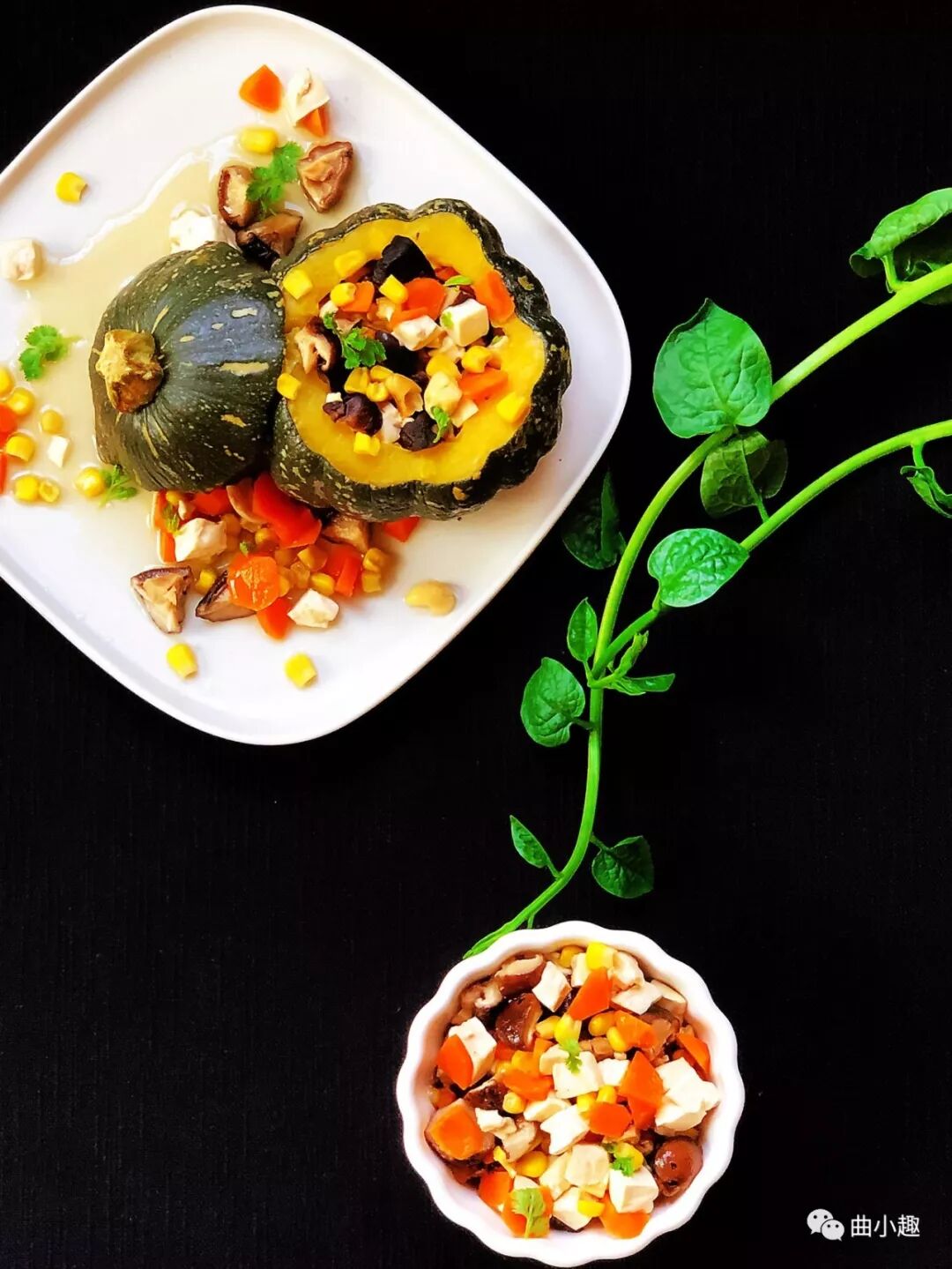 食材:小南瓜一个、胡萝卜一根、豆腐一块、玉米粒半杯、香菇几朵、腰果几粒、盐、香菜
