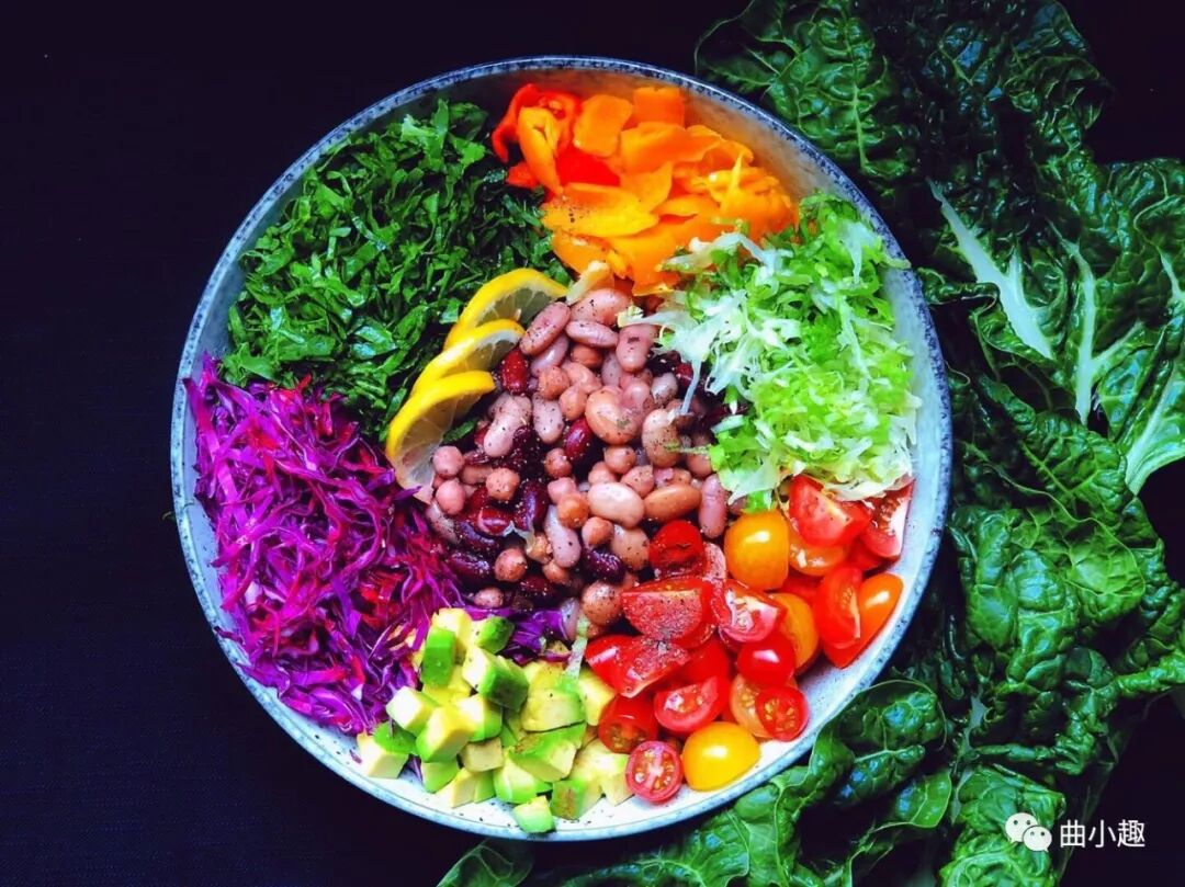 紫甘蓝、莙达菜、甜椒、生菜、小番茄、牛油果、煮好的双色腰豆、盐、黑胡椒、枫糖浆、柠檬全部食材拌匀即可
