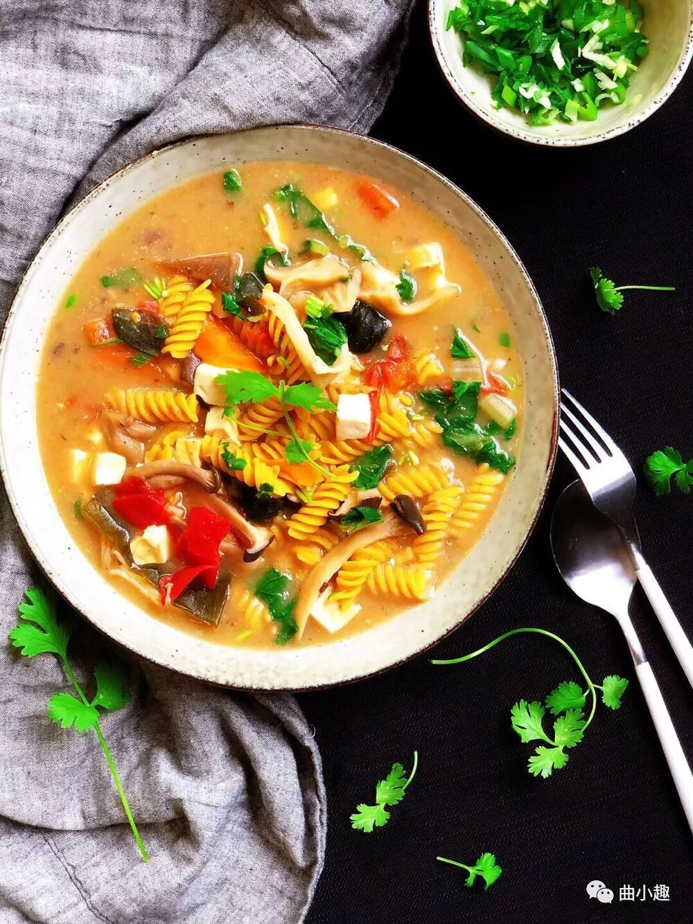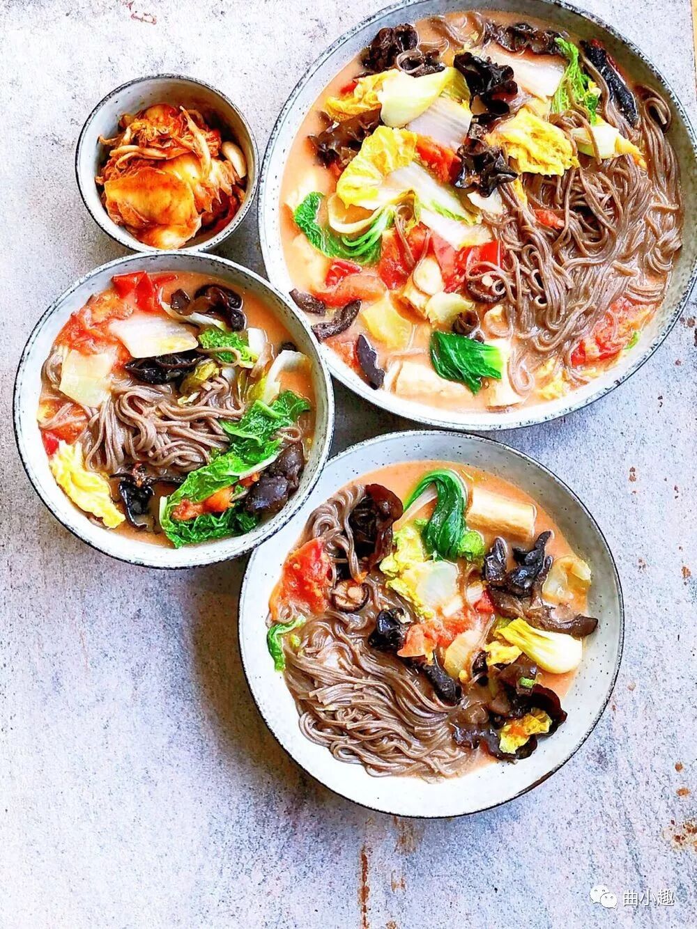 蘑菇、番茄、木耳、豆腐卷、香叶、白味增、生麻酱、盐一起入锅中小火炖出香味,放入荞麦面、白菜、油菜,面熟出锅。