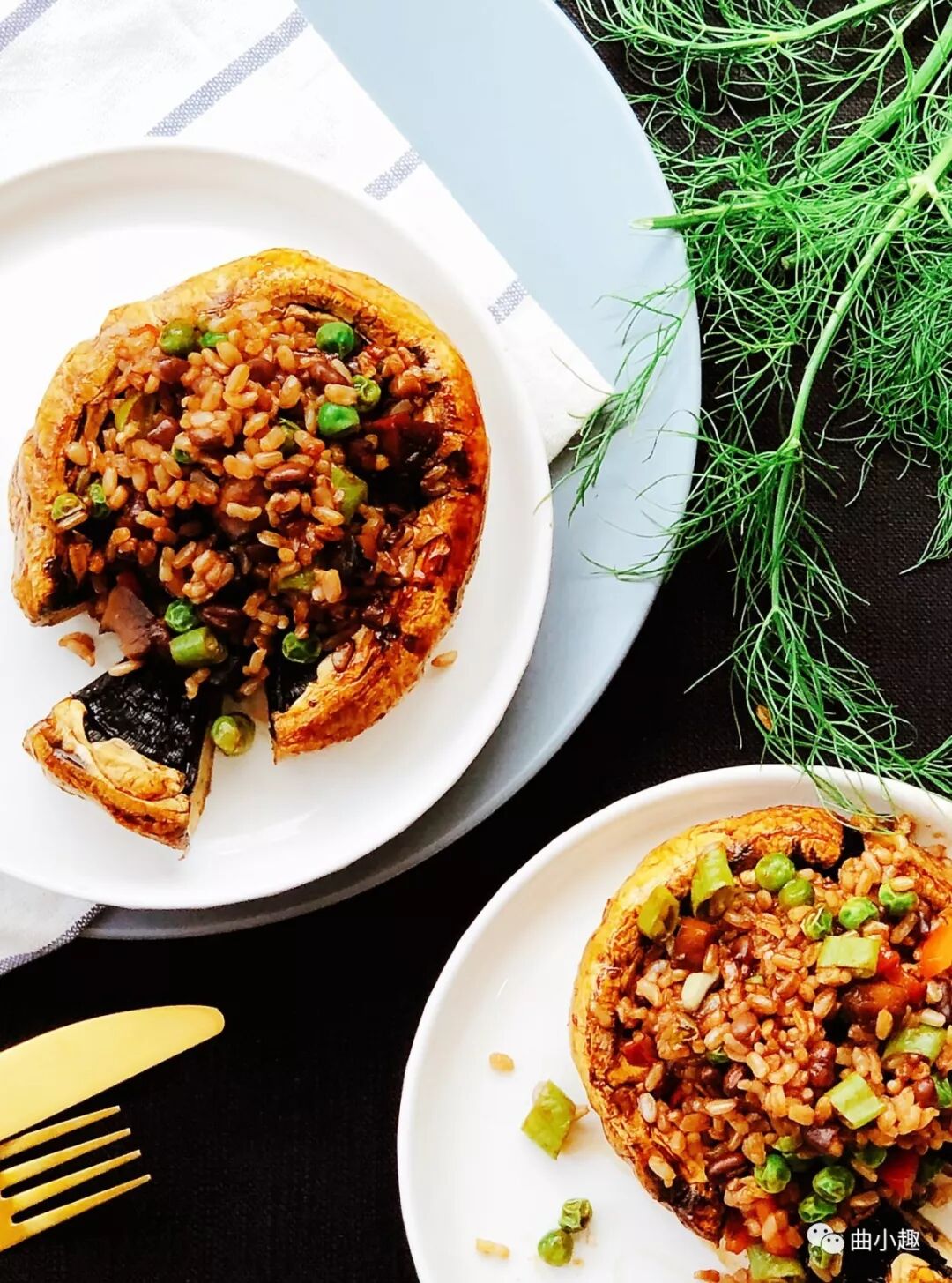大蘑菇放入煎锅,焖好的糙米饭、青豆、甜椒、豆角加有机酱油拌匀,放在蘑菇上,小火盖锅盖煎出汤汁,等汤汁稍微收干,即可出锅。