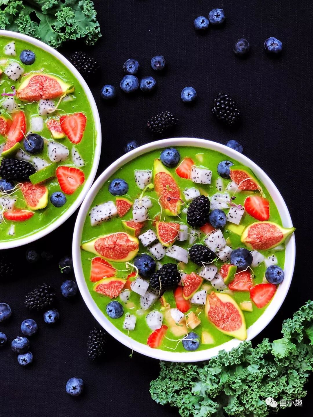 2,把其它所有水果(火龙果、蓝莓、黑莓、梨、无花果)切块放入盘中,撒入芽苗与蔬果昔一起拌着吃。