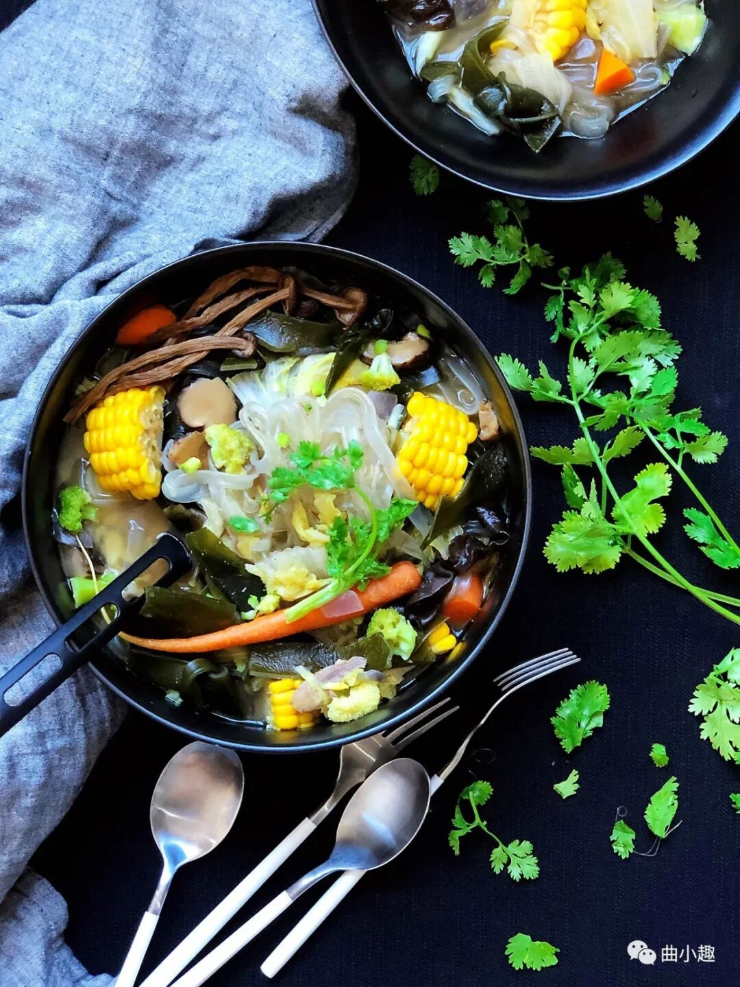 干香菇、茶树菇、海带、木耳浸泡清洗干净,加水小火煮出香味,陆续加入玉米、红薯粉、西兰花、白菜、胡萝卜。