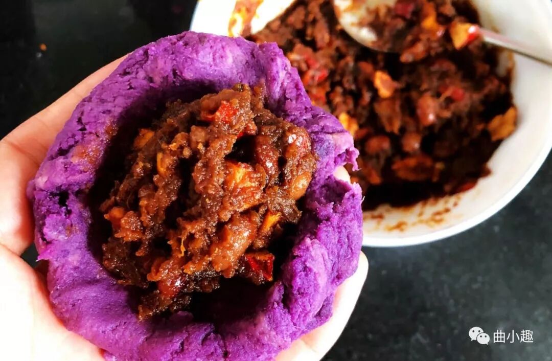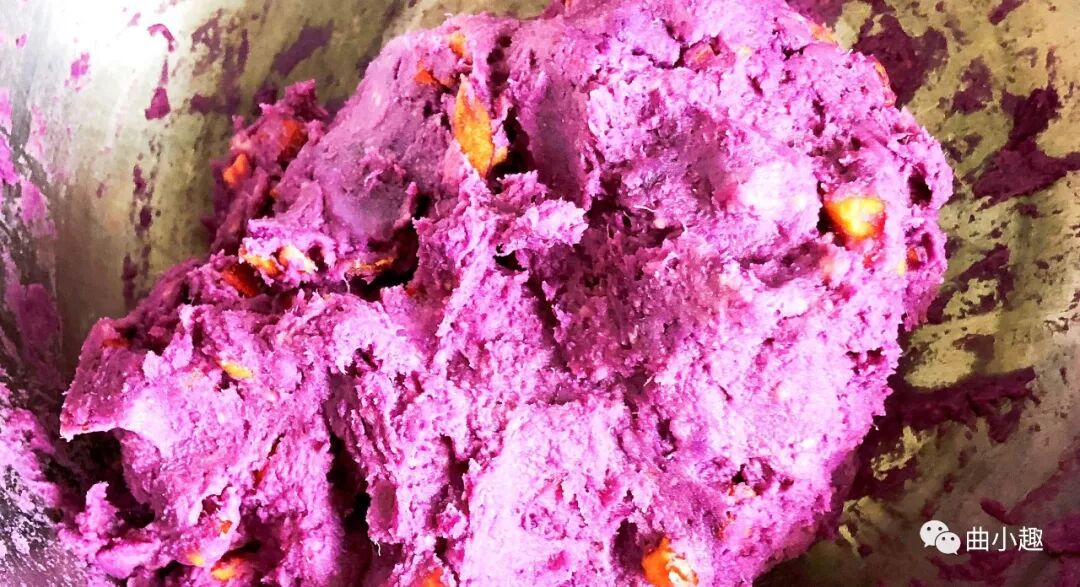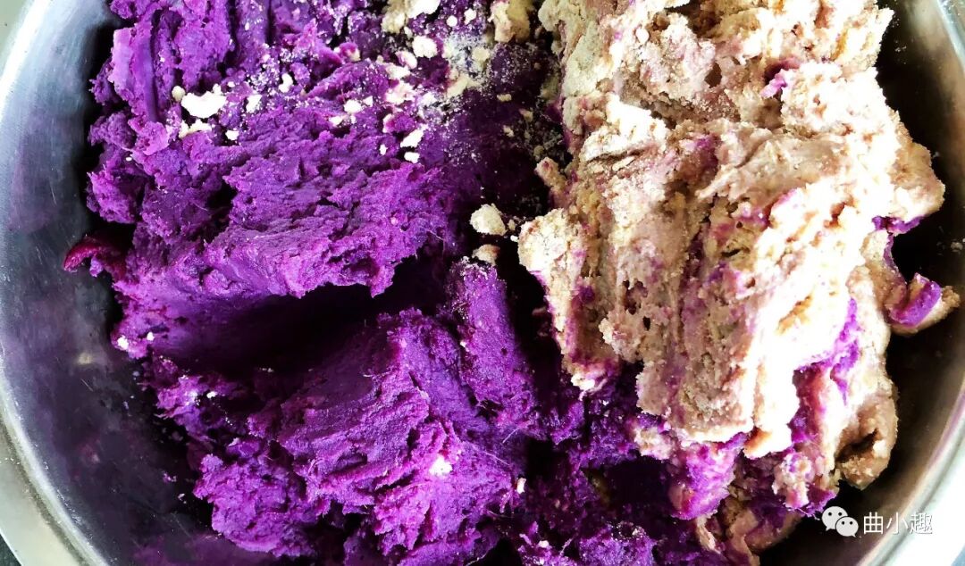 蒸熟后的紫薯压成泥,全麦粉用开水边烫边搅拌均匀(水不要过多,能和成面团即可)。把烫面和红薯泥混合。