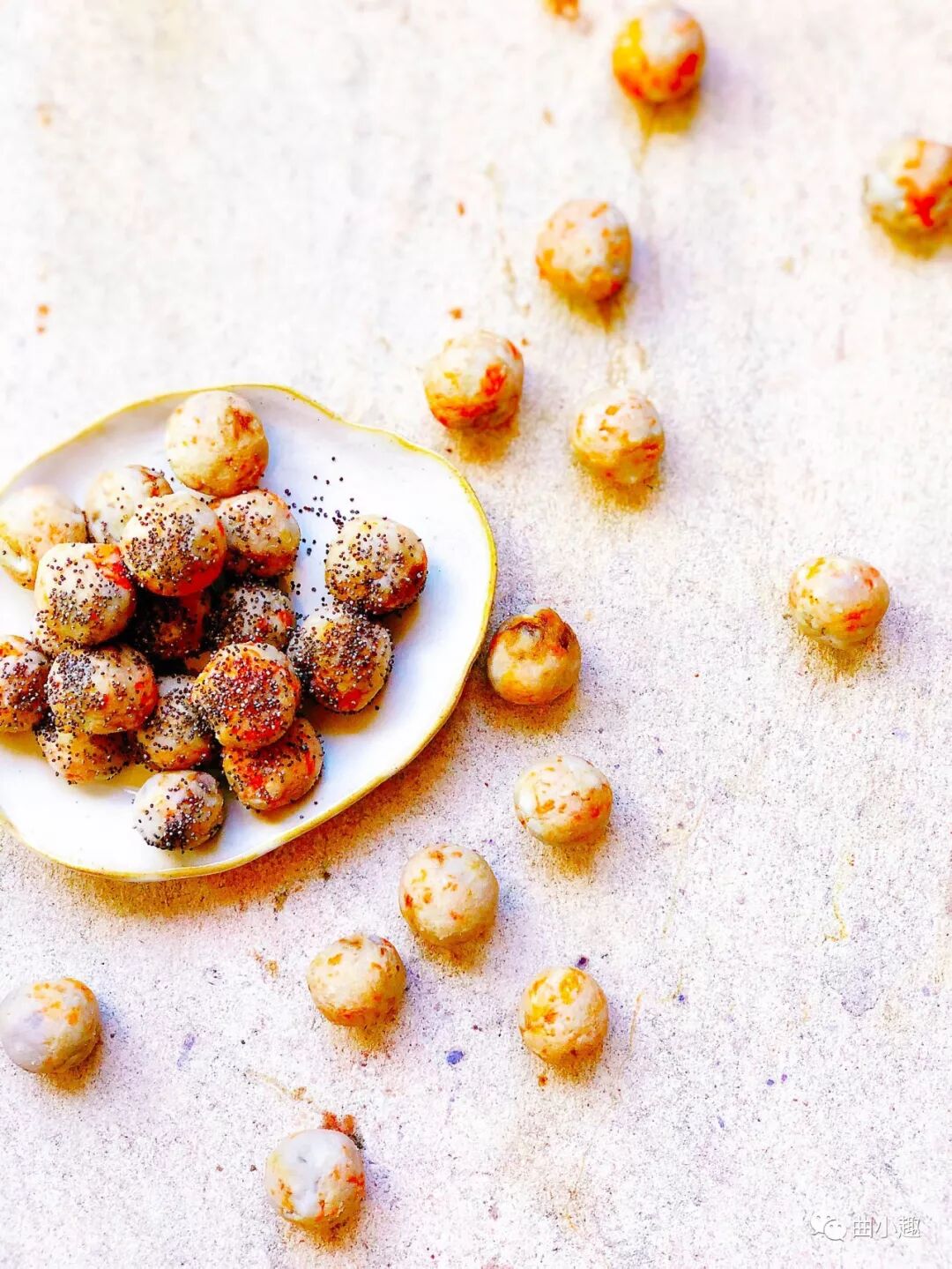 混合好的泥用勺子挖在手心,搓成小丸子,外面还可以裹上可以直接吃的小草籽,比如画眉草籽、奇亚籽等。直接开吃吧。