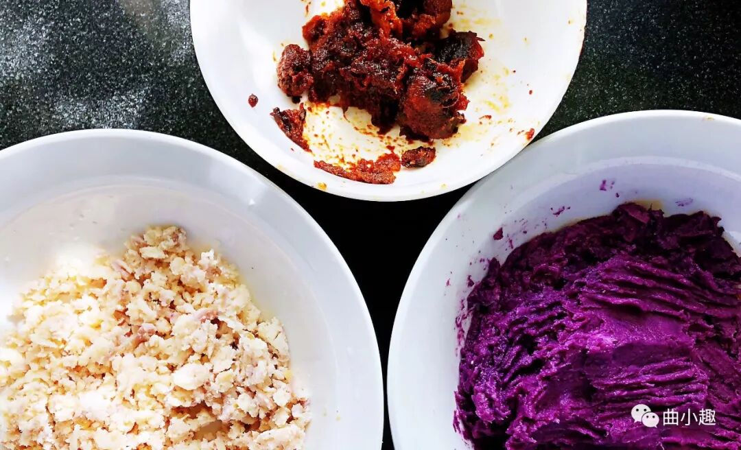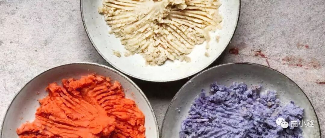 胡萝卜、白薯、紫薯等蒸熟,用叉子压成泥。