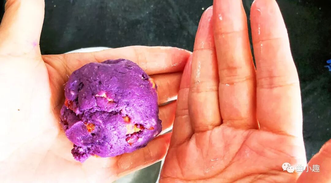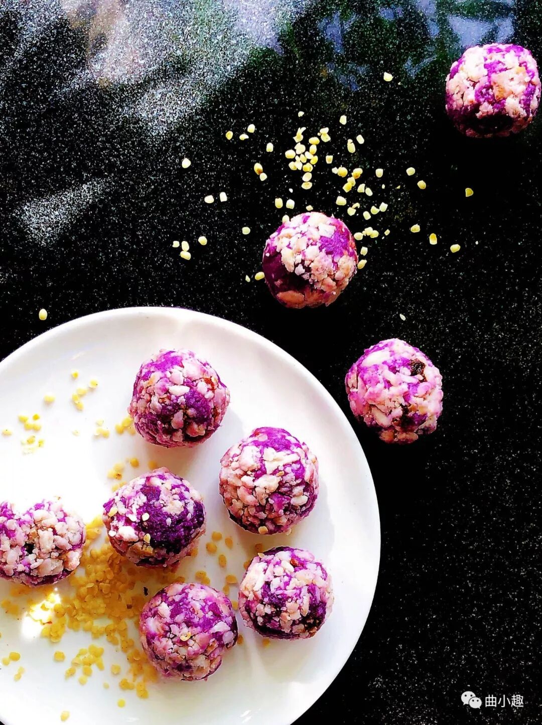 紫薯泥和红枣泥混合成团,滚上山药碎,轻搓成球状。还可裹上火麻仁等一起吃。