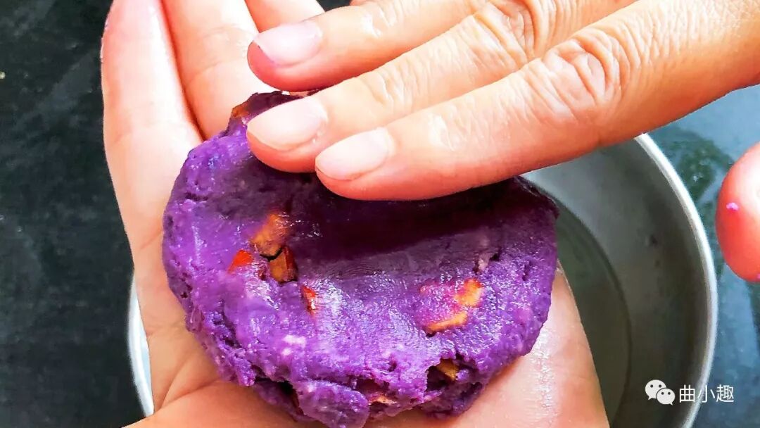 手上沾水,取红薯泥揉成团。压成饼,取红豆枣泥馅包进去,再次揉成团,轻压成饼。