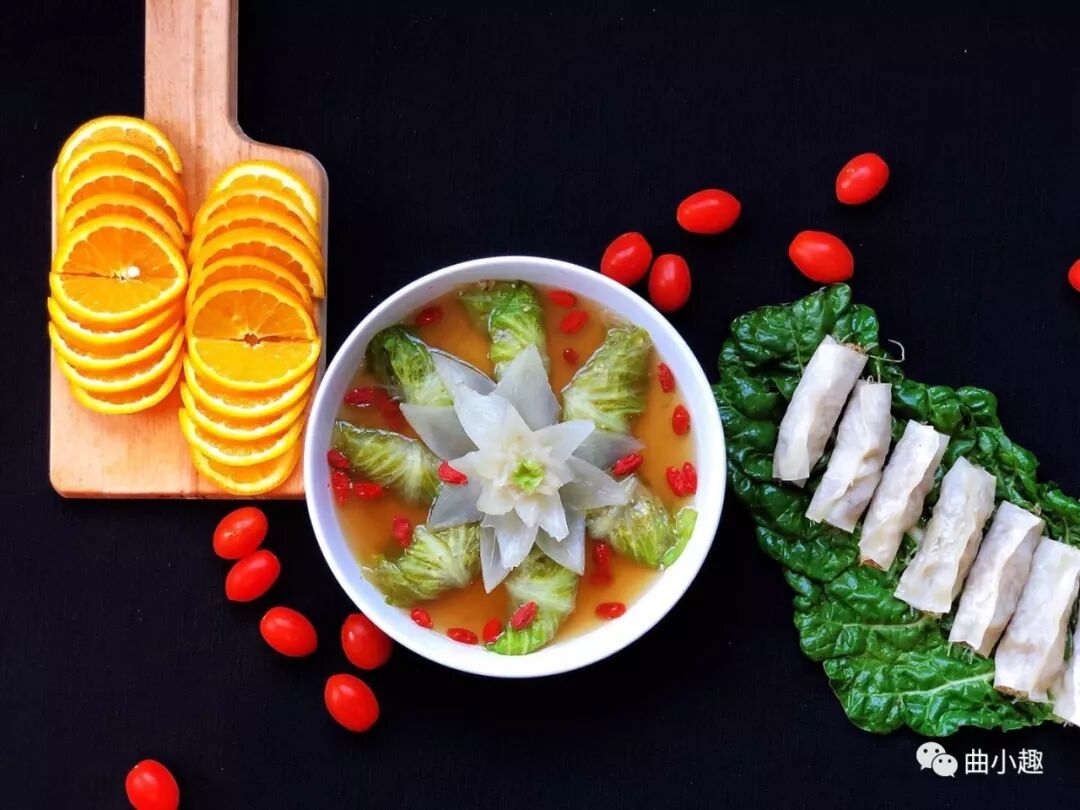 水煮白菜+白胡椒+盐。白菜叶卷成卷装盘,白菜帮用剪刀稍微修饰成花朵状,倒入白菜汤,撒上枸杞。