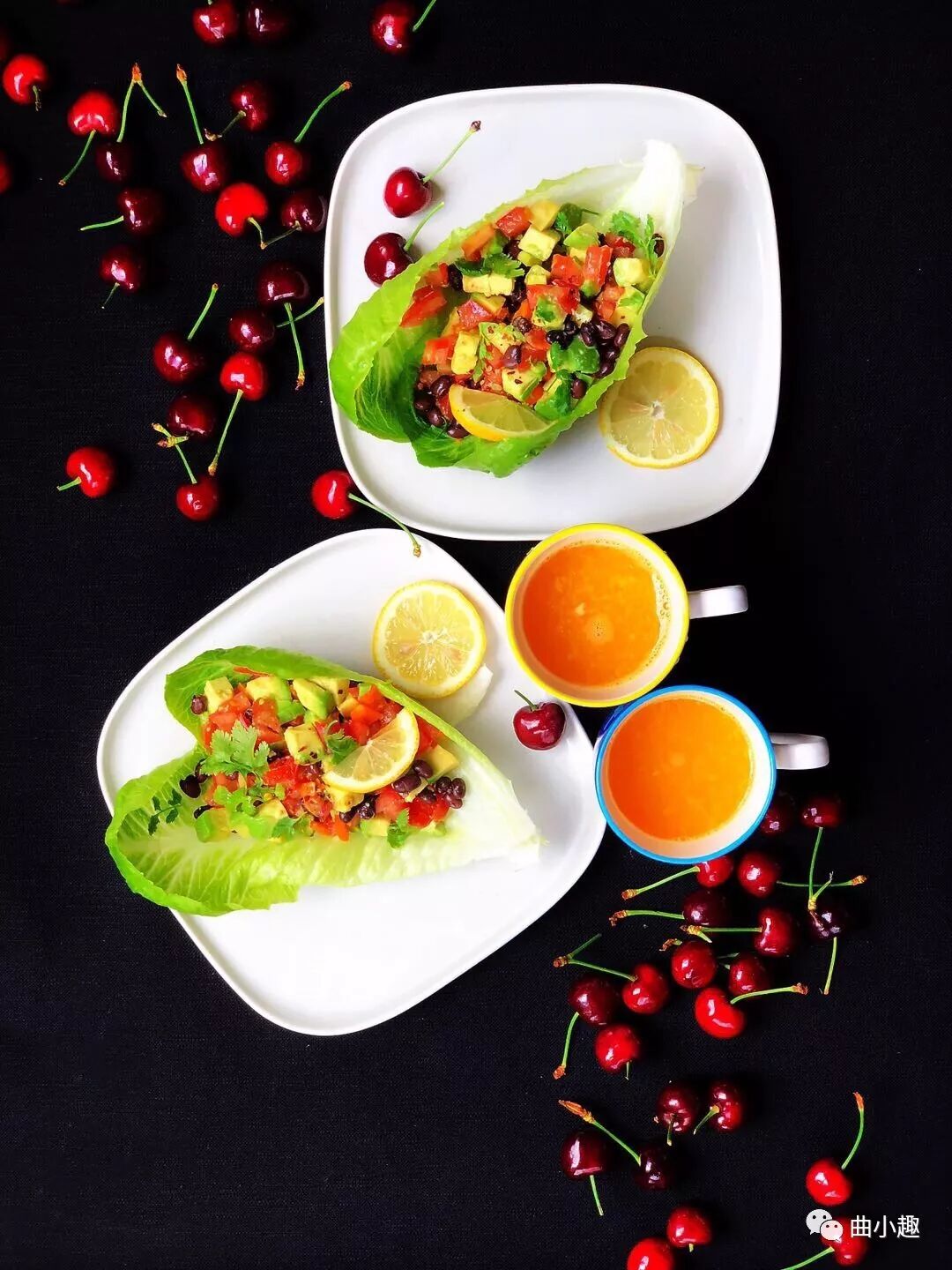 以生菜为托,把牛油果、番茄切块,与黑豆、香菜拌在一起,上面撒上坚果碎、黑胡椒、盐,挤上柠檬汁。