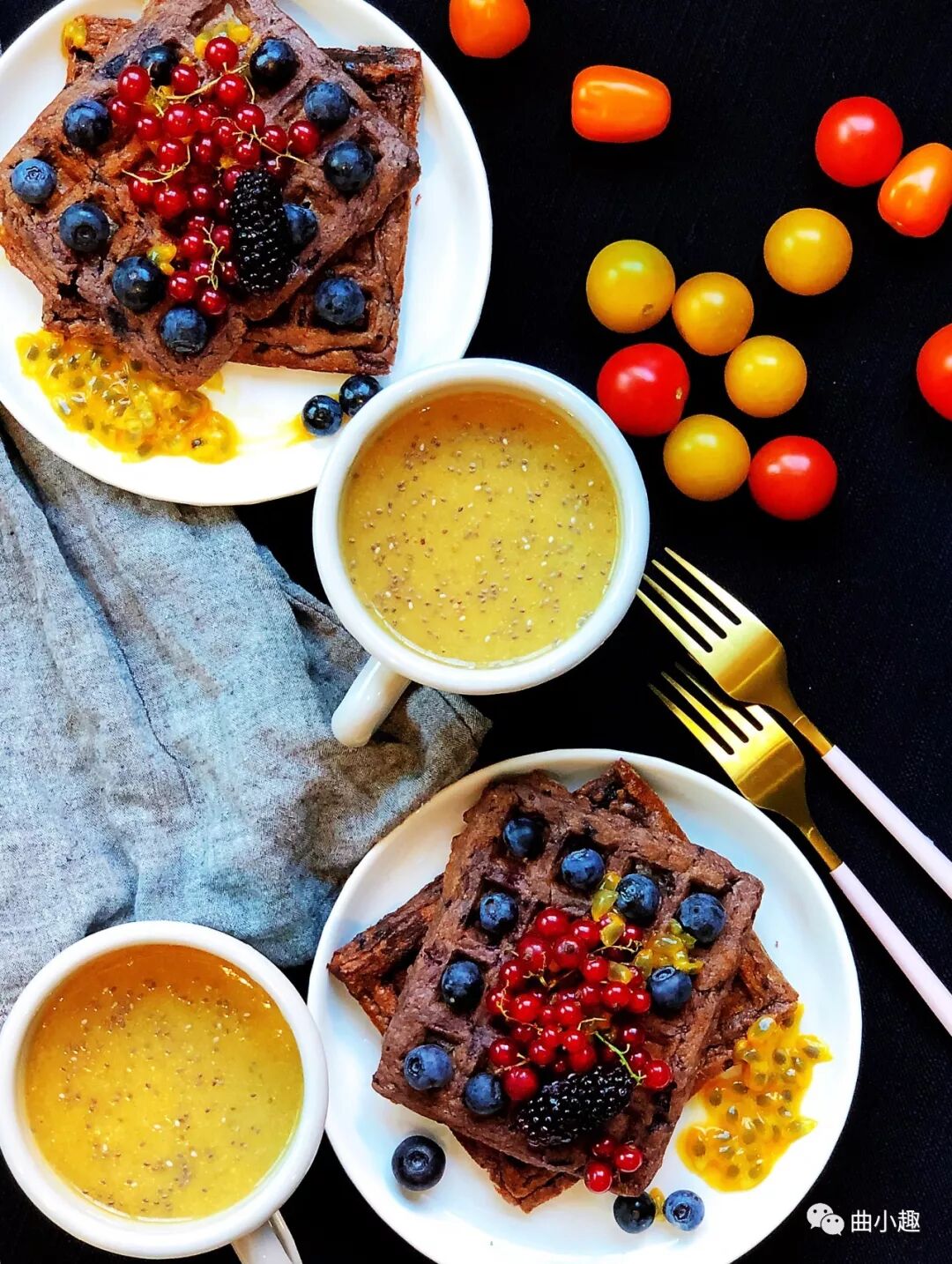 把蒸红薯、燕麦、小扁豆粉、全麦粉、香蕉加水拌匀,放进华夫饼机器制作成粗粮华夫饼,放入盘中,摆上蓝莓、黑莓、百香果、红醋栗