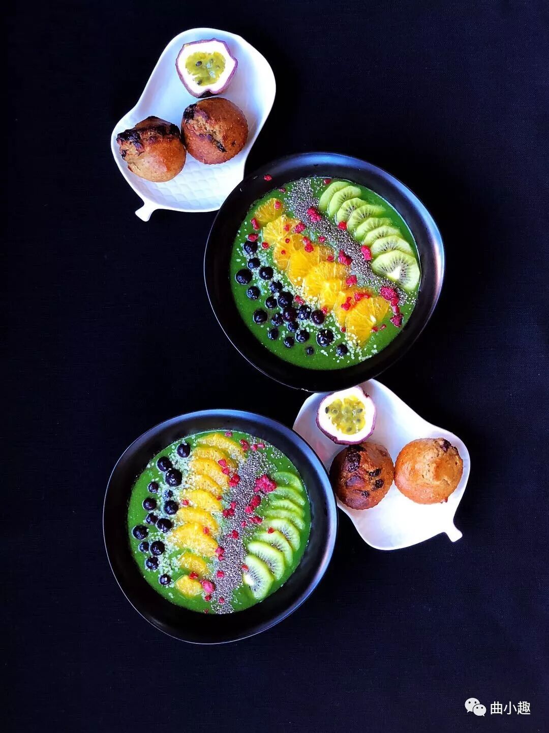 蔬果昔:茼蒿、黄瓜、羽衣甘蓝、香蕉、苹果、亚麻籽、柠檬、椰枣加水,用破壁机打匀。装饰:猕猴桃、橙子、奇亚籽、火麻仁、蓝莓、树莓