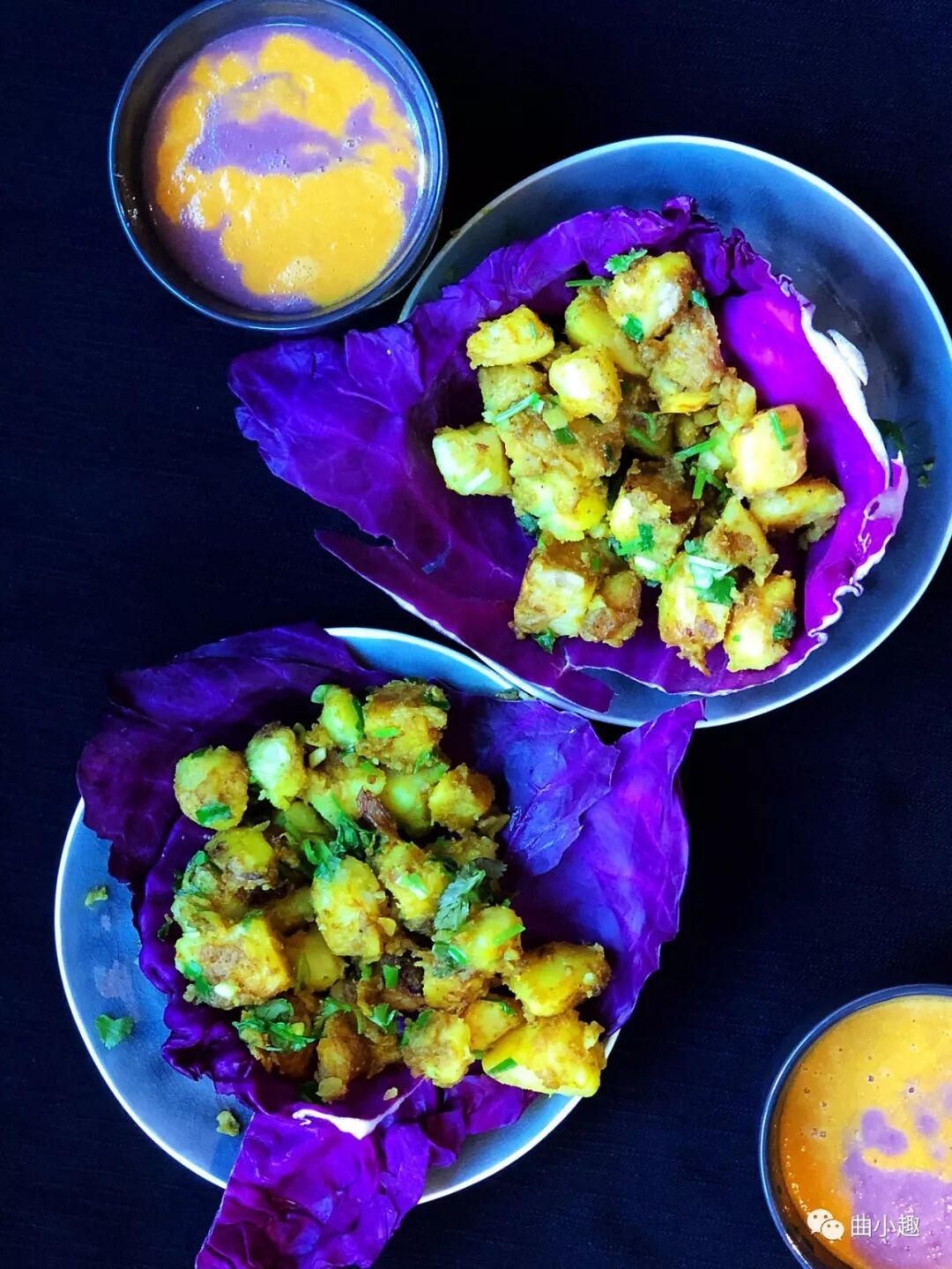 土豆煮熟,切块放进炒锅,加孜然粉、姜黄粉、花椒粉小火煸几分钟,盛入盘中紫甘蓝叶上,撒上香菜,用紫甘蓝叶片部分包着吃。