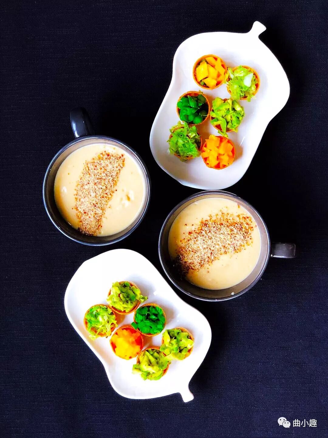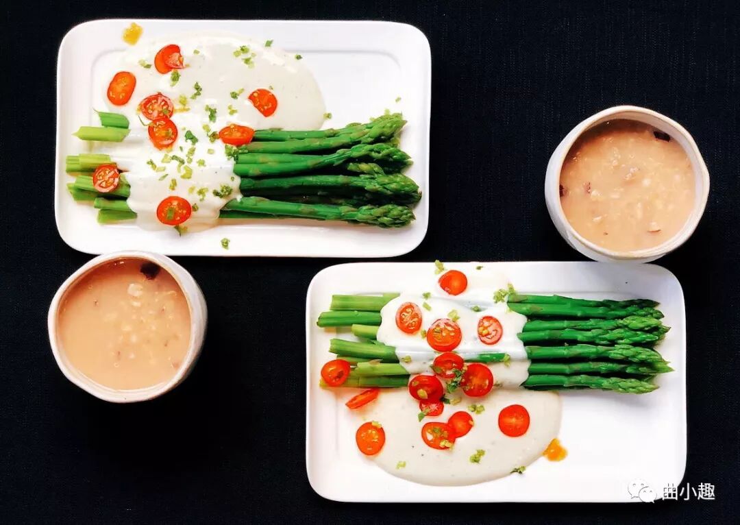 土豆煮熟,加椰奶、盐、黑胡椒打成糊,浇在芦笋(用水焯10秒)上,撒上小番茄、香菜。