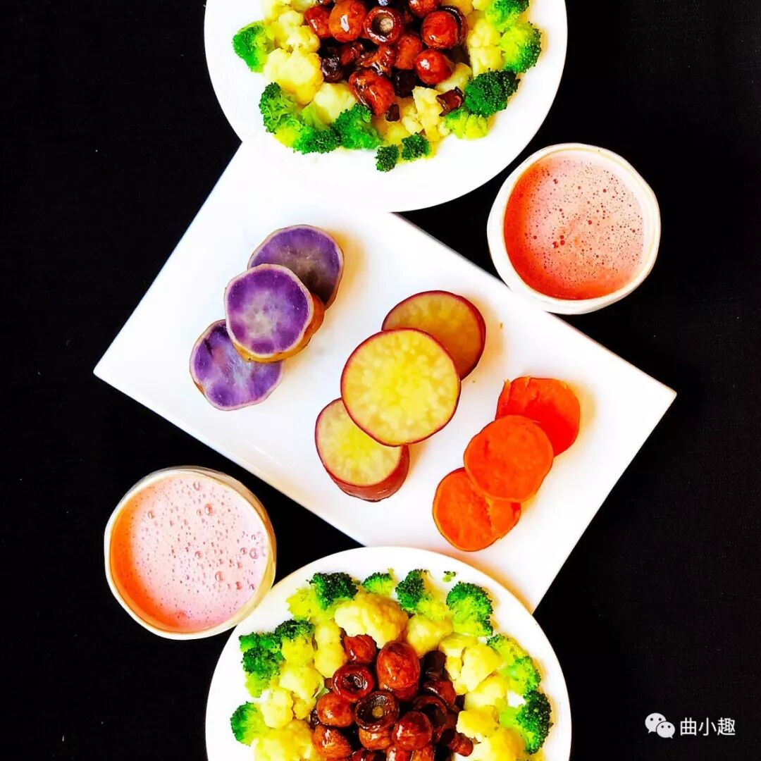 紫甘蓝、白菜、香蕉、苹果、亚麻籽、柠檬、葡萄干(紫色部分)+胡萝卜(黄色部分)