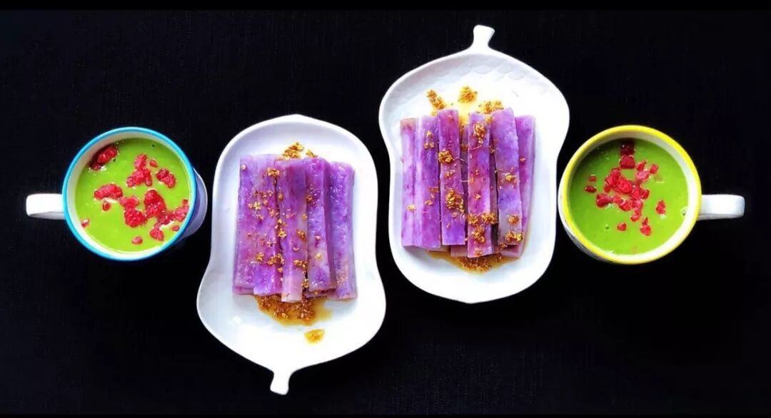 紫山药切条焯水3分钟,捞出过凉水,装盘后撒上干桂花、枫糖浆