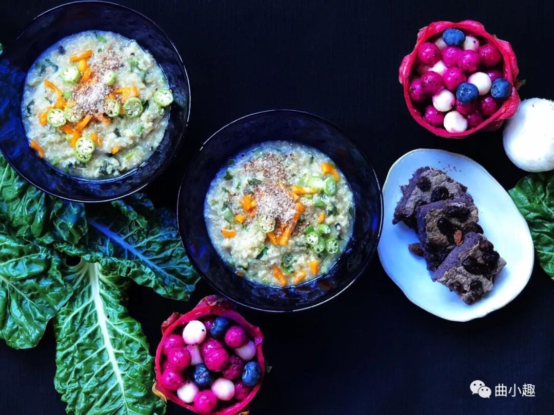 藜麦、燕麦片、蘑菇片加水煮十分钟,加入牛皮菜(莙达菜)、羽衣甘蓝、生菜再煮五分钟,撒入彩椒碎、秋葵片、综合种子粉、盐。