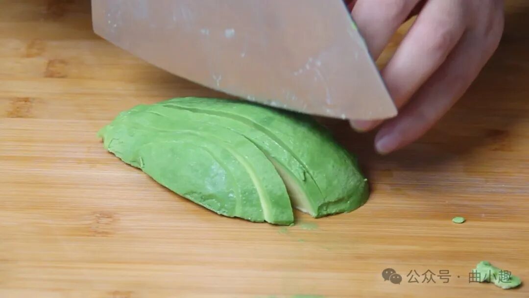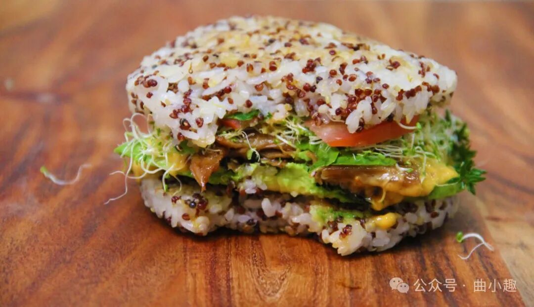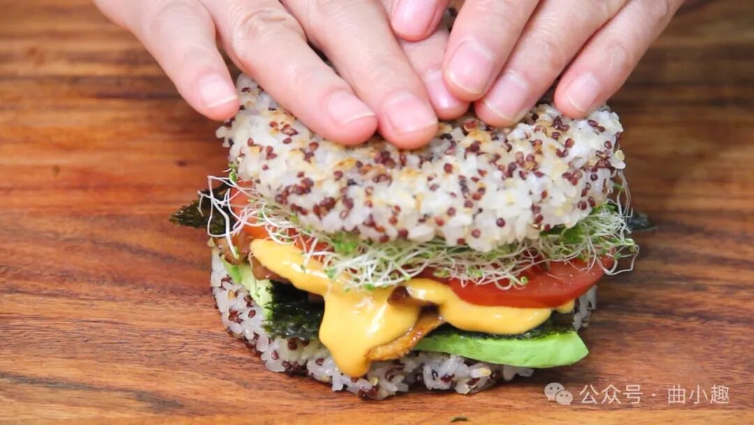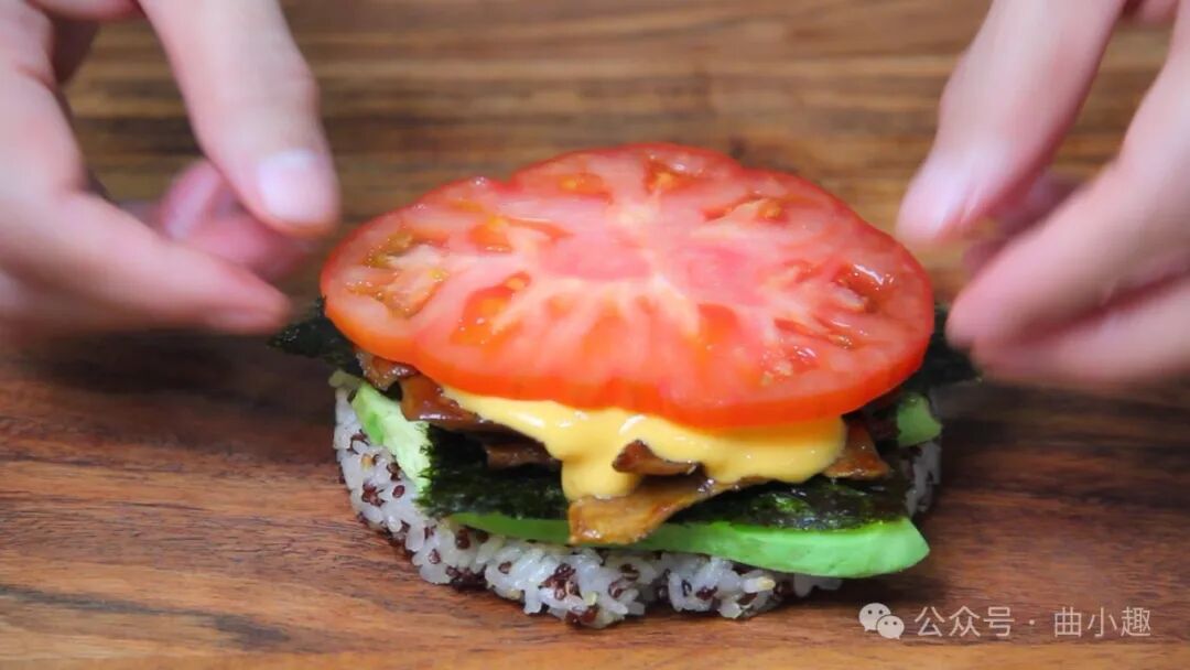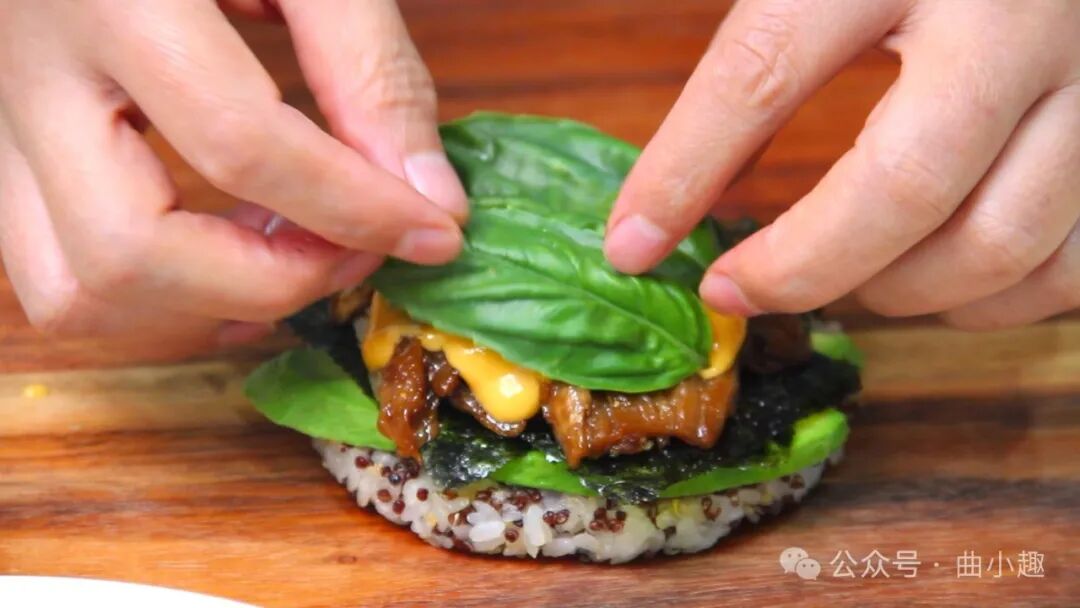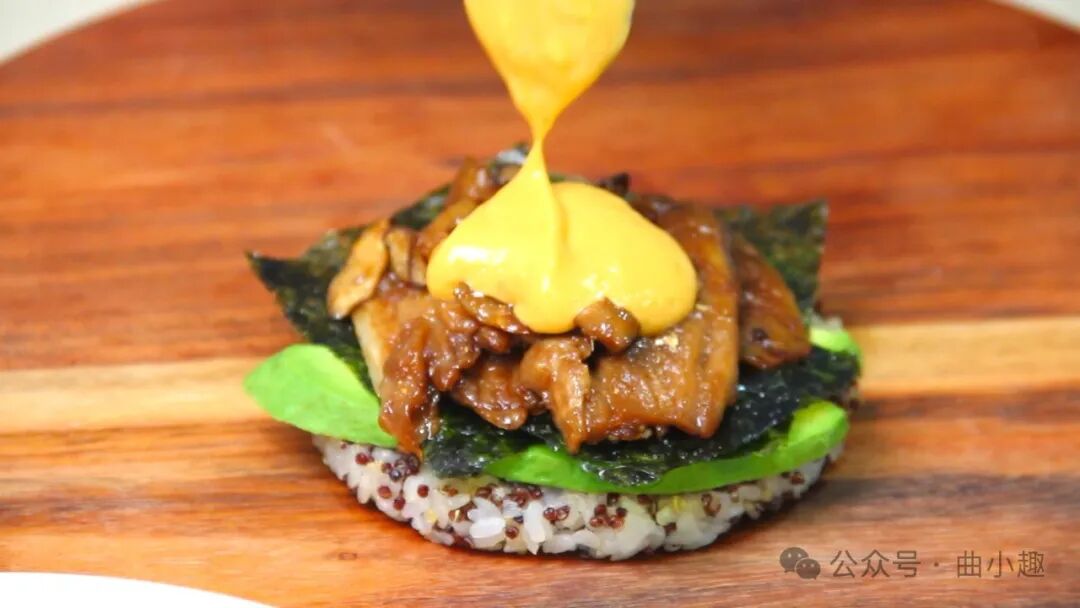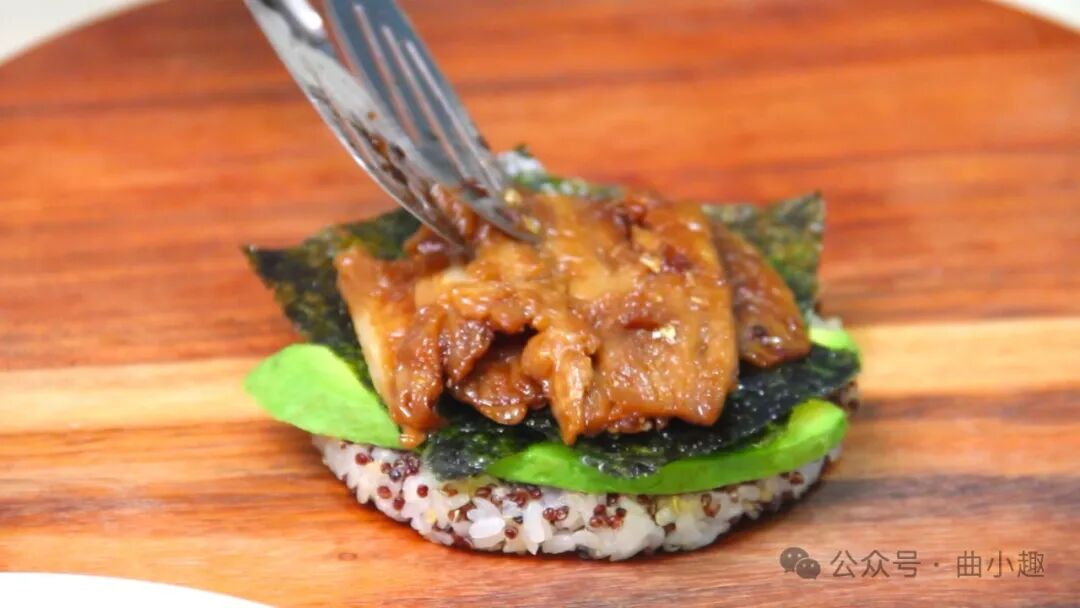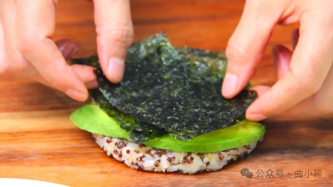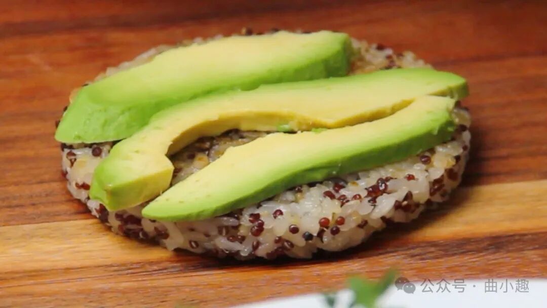 取煎好的米餅一片,然後在上面擺放一層牛油果片和3片海苔片|Take one fried rice patty and layer it with avocado slices and 3 sheets of nori
