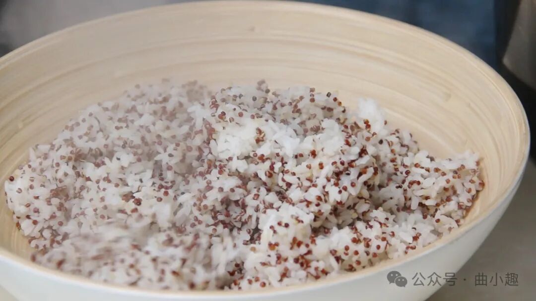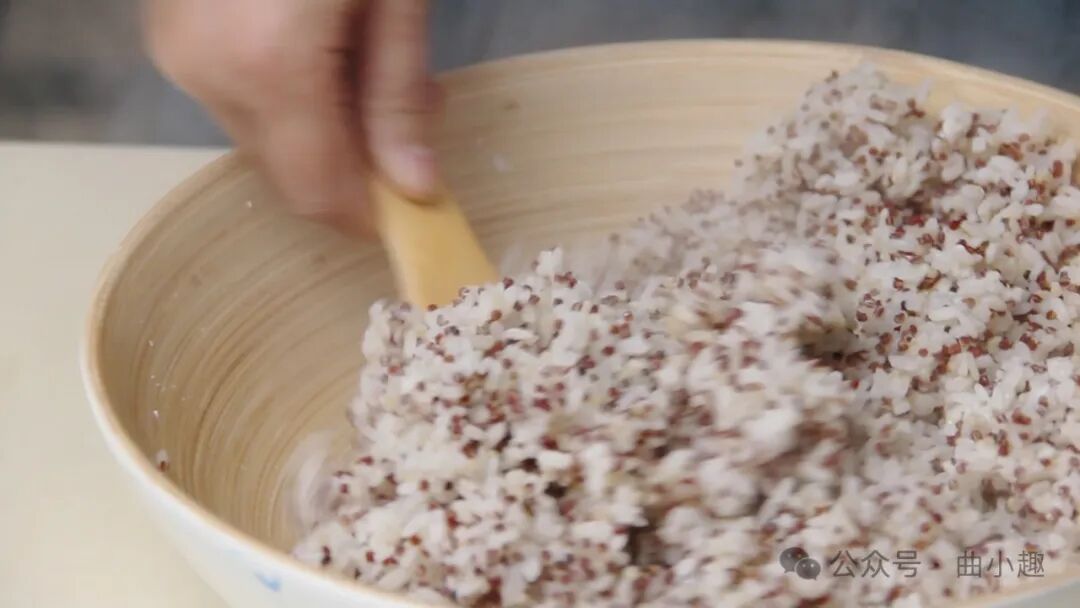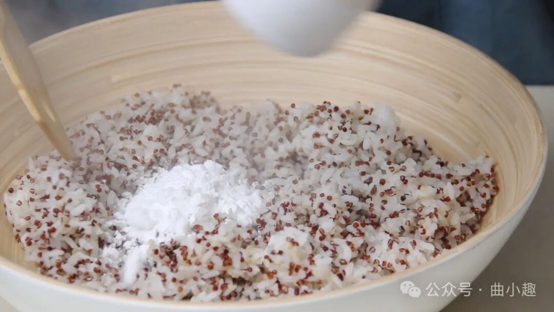 從鍋中取出4碗剛焖好的熱米飯,趁熱加入再來米粉(粘米粉),拌均勻,這樣做的米餅不會散|Remove 4 bowls of freshly cooked hot rice from the pot, mix in rice flour while hot to prevent the rice patties from falling apart