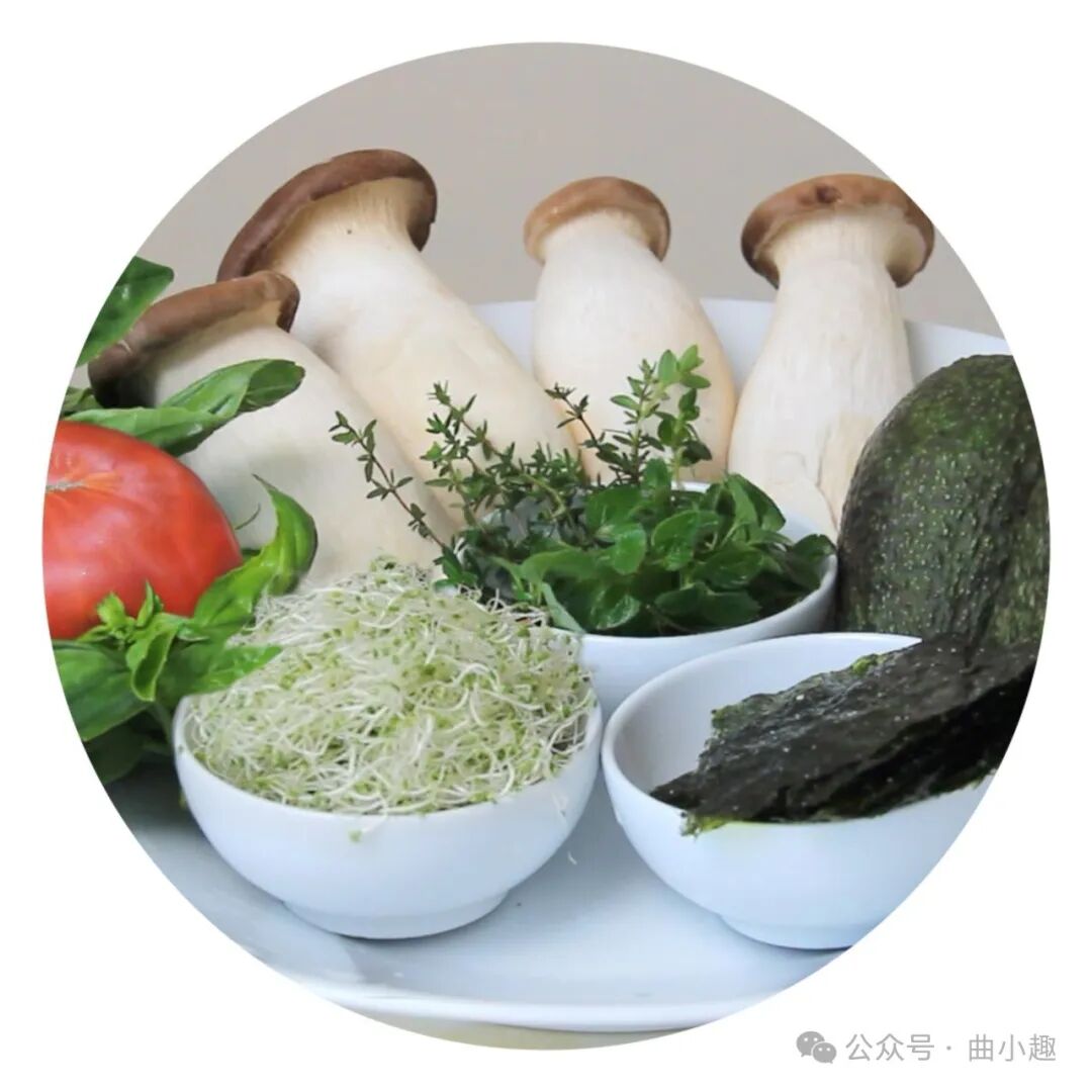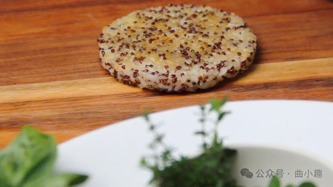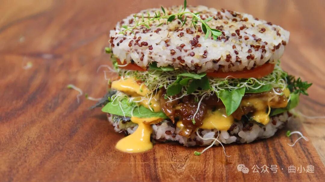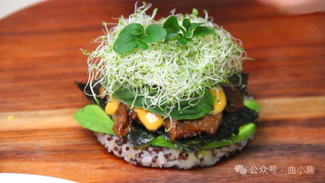 放上一片番茄,最後放芽苗、百里香、羅勒,蓋上另一片米餅就完成了| Top with a tomato slice, microgreens, thyme, and basil, then cover with another rice patty to complete the burger
