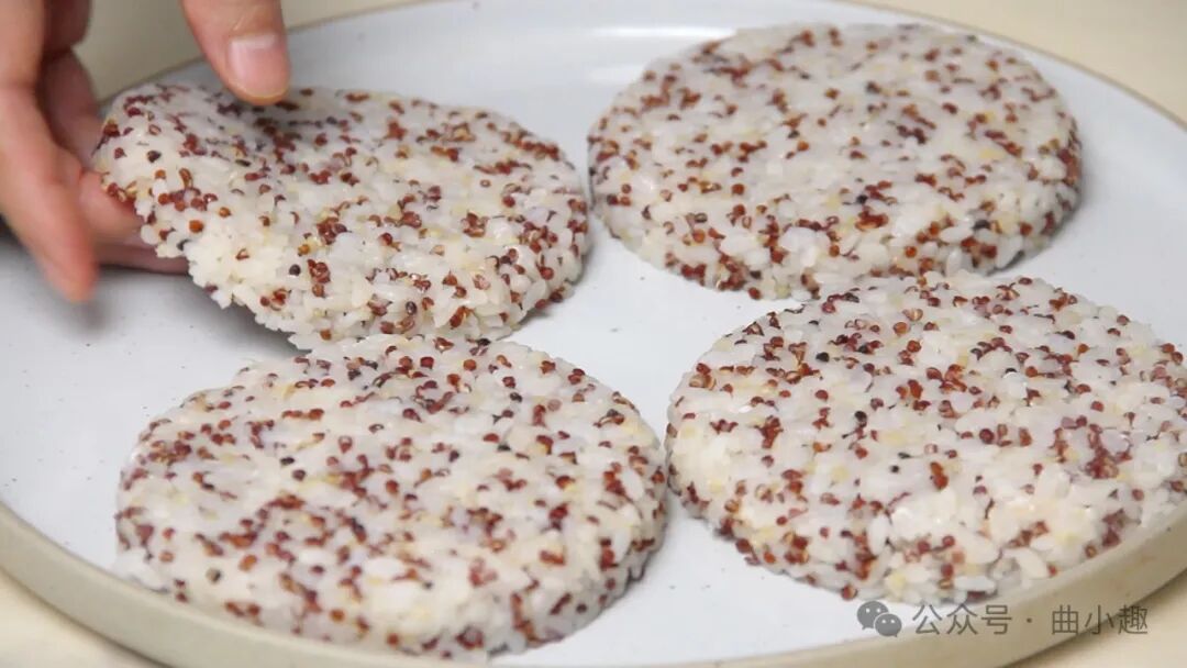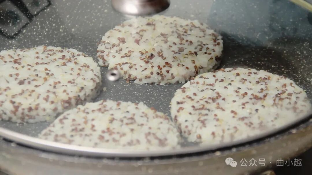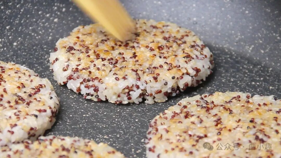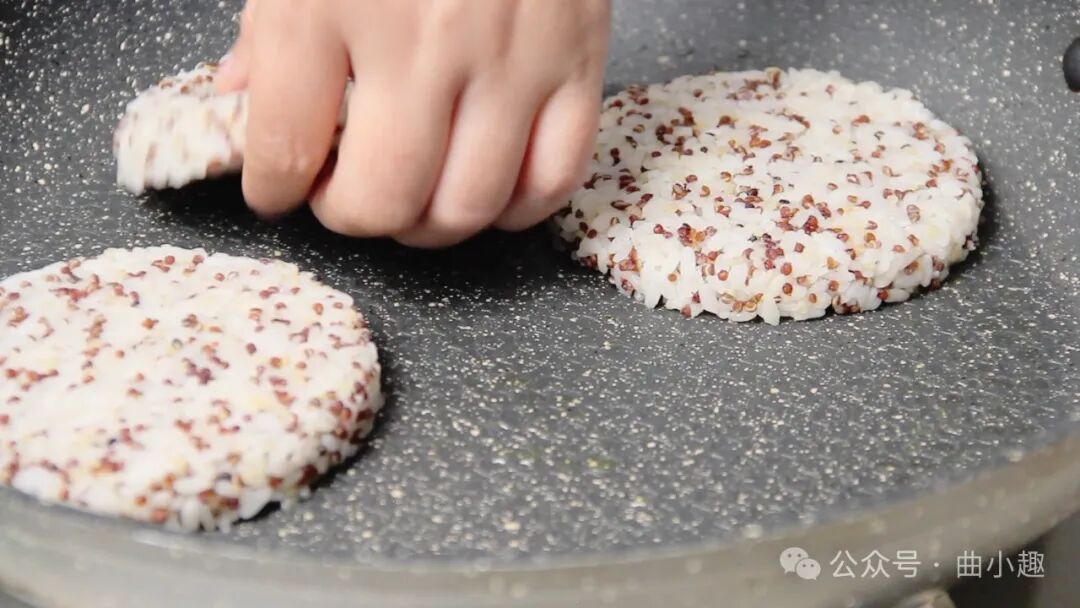 不粘鍋刷少許油,放入米餅,小火煎至1面金黃,約5-8分鐘| Brush a non-stick pan with a little oil, add the rice patties, and fry on low heat until one side is golden, about 5-8 minutes