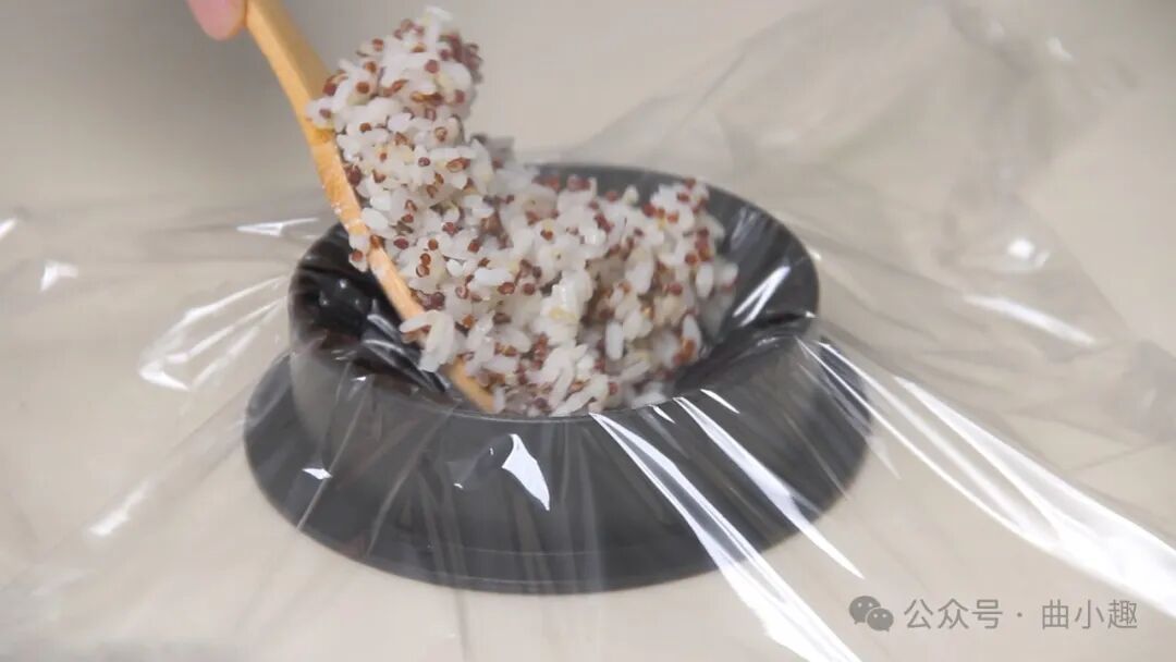 把保鮮膜鋪在漢堡模具中,加入半碗米飯,用力壓實成餅。如果沒有模具,用手把米飯反覆揉捏成圓球狀,壓扁,再稍微整理邊緣即可,共8個米餅| Line a burger mold with plastic wrap, add half a bowl of rice, and press firmly into a patty. If you don't have a mold, shape the rice into balls with your hands, flatten them, and smooth the edges. Repeat for all rice to make 8 rice patties