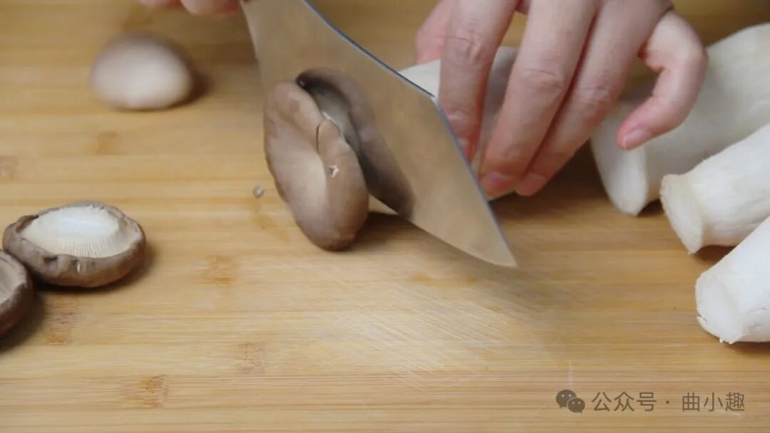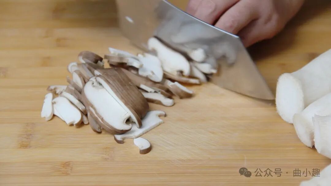 清洗杏鮑菇後切下傘蓋,並把傘蓋切成薄片|Clean king oyster mushrooms, remove the tops, and slice thinly