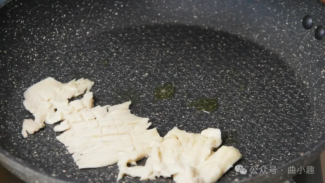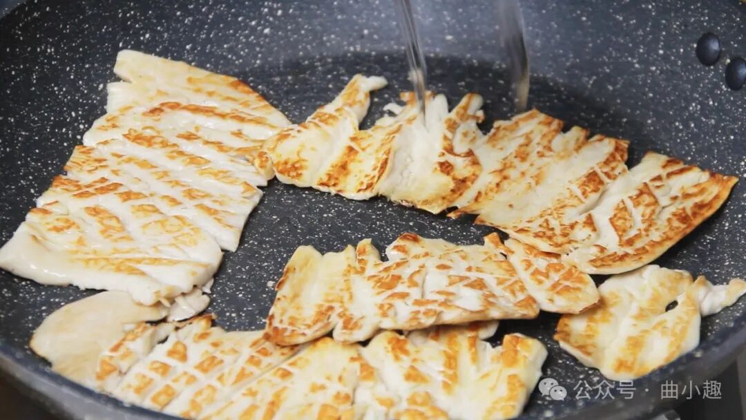 不粘鍋少油或無油, 用中火將杏鮑菇片及之前切下的杏鮑菇傘蓋片煎至兩面焦黃,約4到6分鐘|Heat a non-stick pan with a little oil over medium heat, fry mushroom slices and the previously cut tops until golden on both sides, about 4-6 minutes