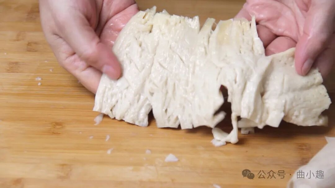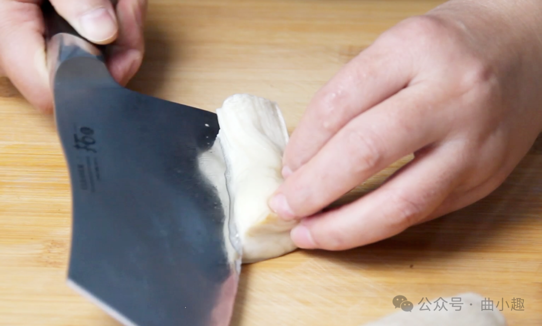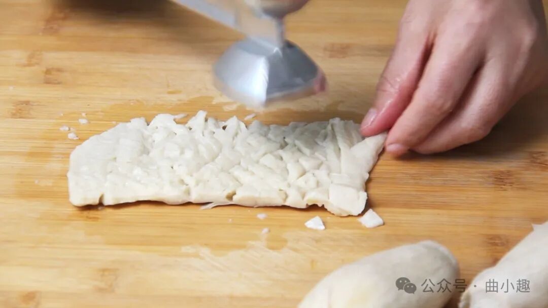用刀在杏鮑菇片上輕輕劃十字,有紋理就好,不要劃透,用敲肉錘輕輕敲打杏鮑菇片的每一面,直至菇肉變得鬆軟。如沒有肉錘,用刀背多敲幾次也可以|Lightly score the mushroom slices in a crosshatch pattern, then tenderize with a meat mallet until soft. If you don't have a meat mallet, use the back of a knife