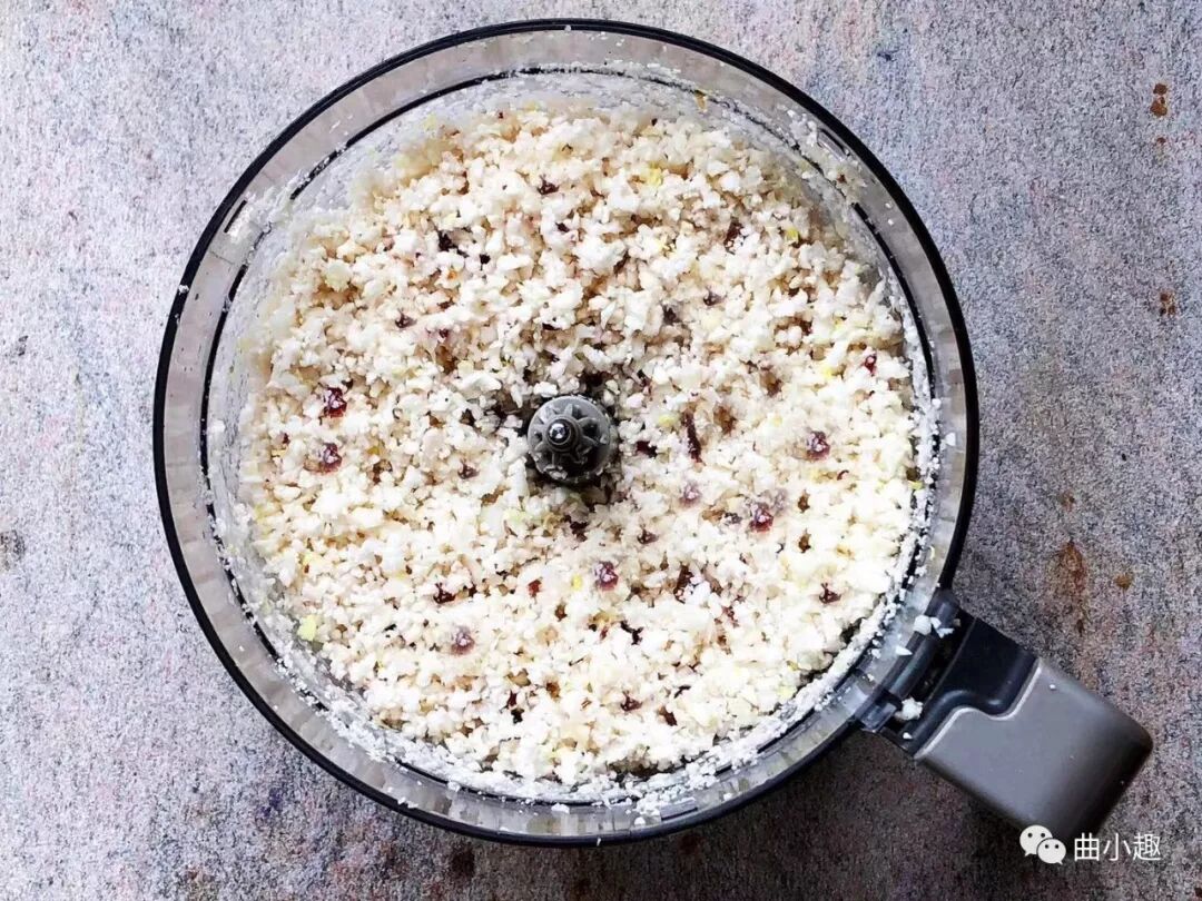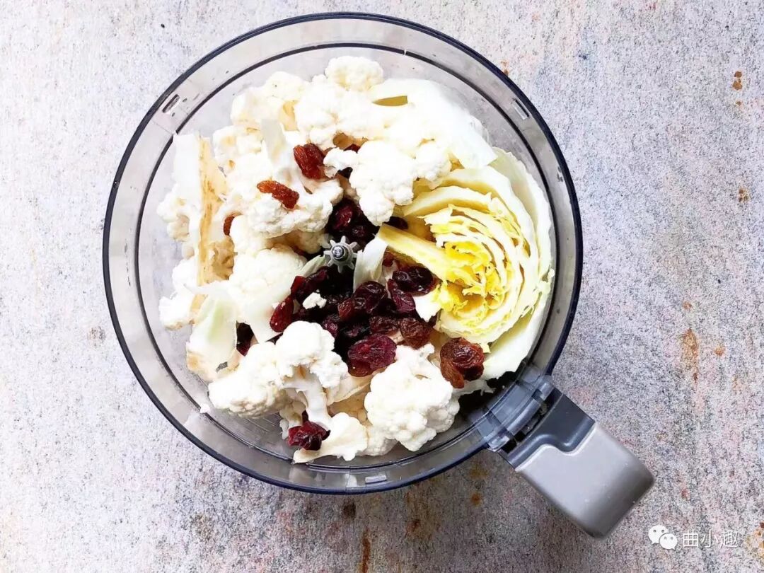 将花椰菜、白菜、蔓越莓一起放在料理机打碎,大概大米大小即可,不要太碎了,打成泥就不好了。