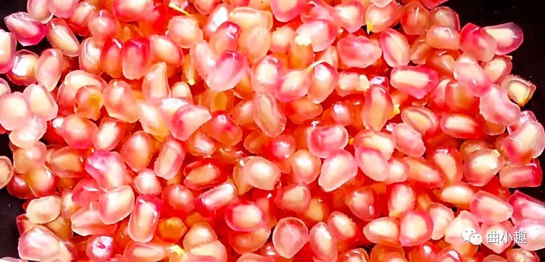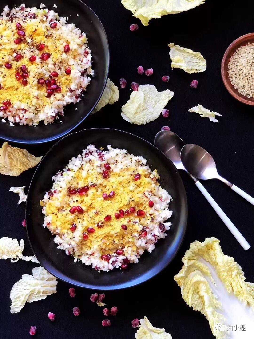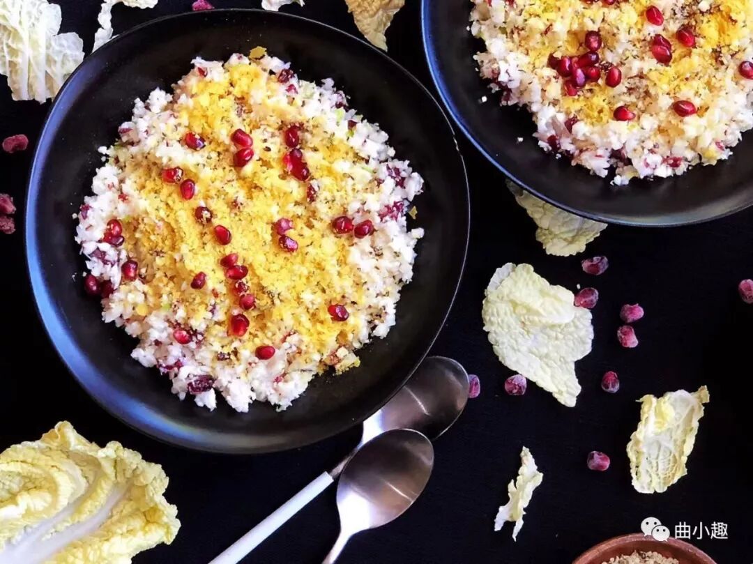 把打好的花菜米倒入盘中,撒上火麻仁、营养酵母,最后再撒上石榴籽,大功告成,酸酸甜甜,很开胃。
