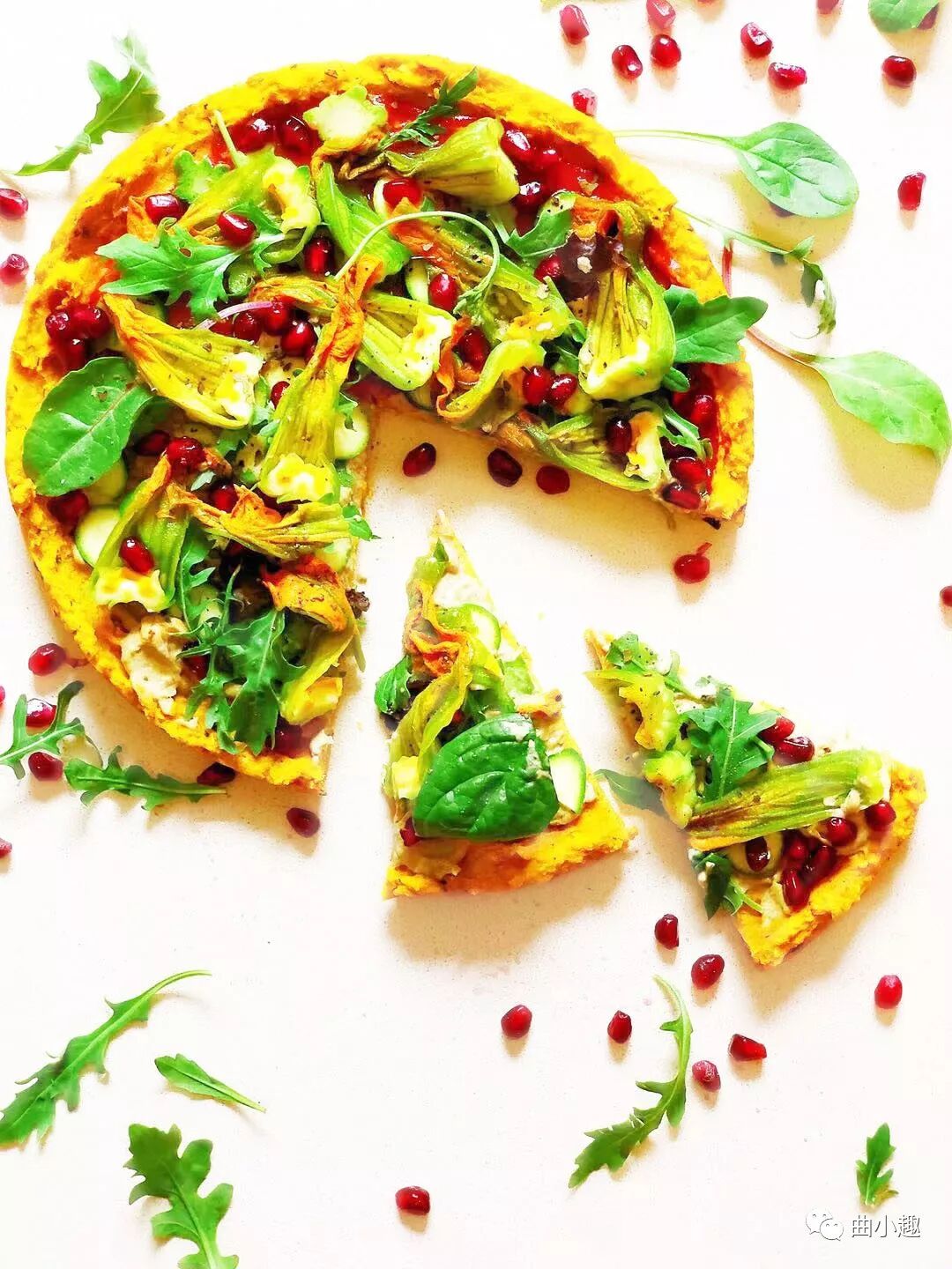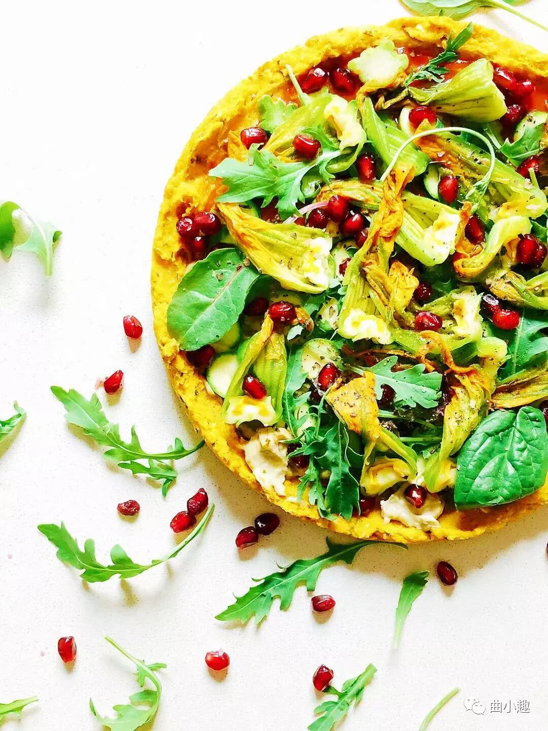 5,把芝麻菜、小菠菜、生菜、西葫芦花、西葫芦、石榴籽全部撒在烤好的底托上,拧上烧烤用香草料,挤一点柠檬汁。