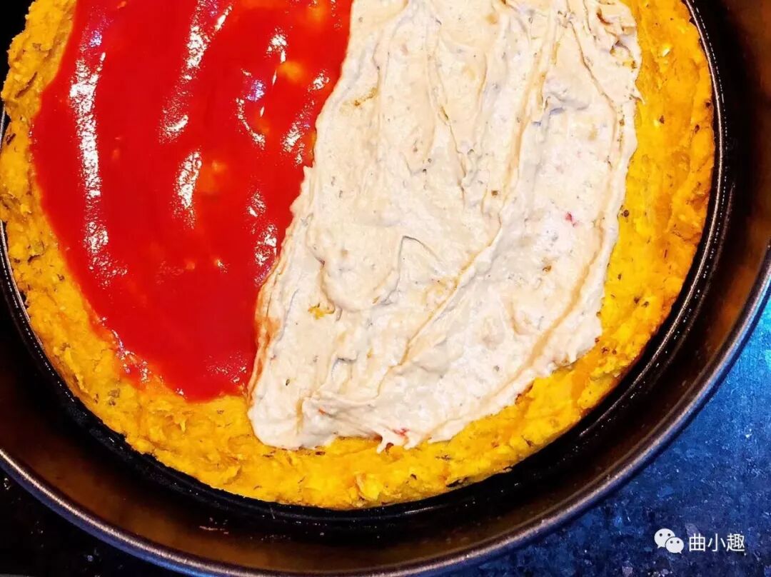 4,在底托上抹上一半鹰嘴豆泥,一半纯番茄酱。