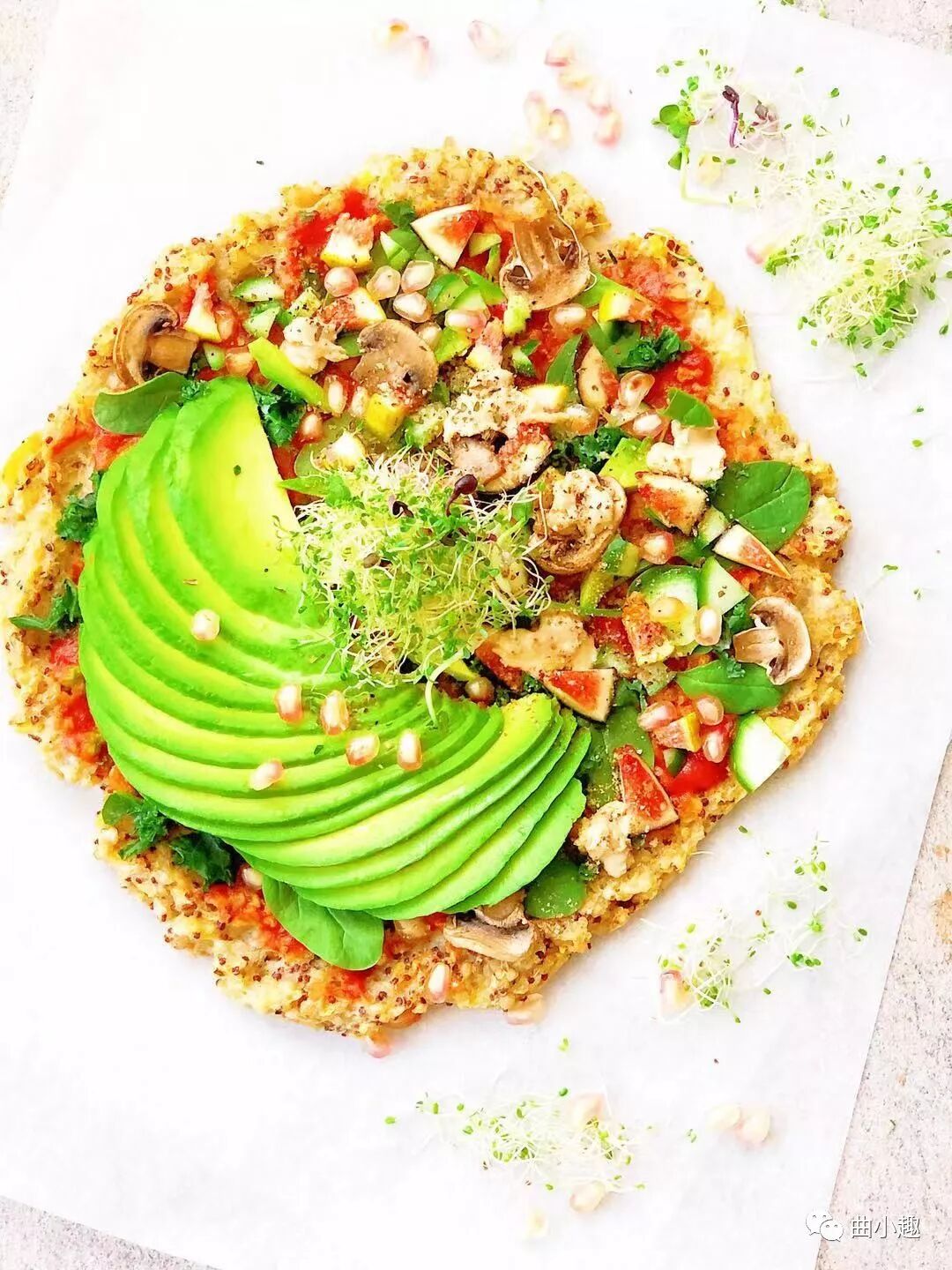 纯番茄酱、蘑菇、羽衣甘蓝、小菠菜、牛油果、黄瓜、无花果、石榴籽、芽菜、自制腰果酱、烧烤香草料