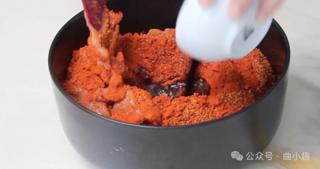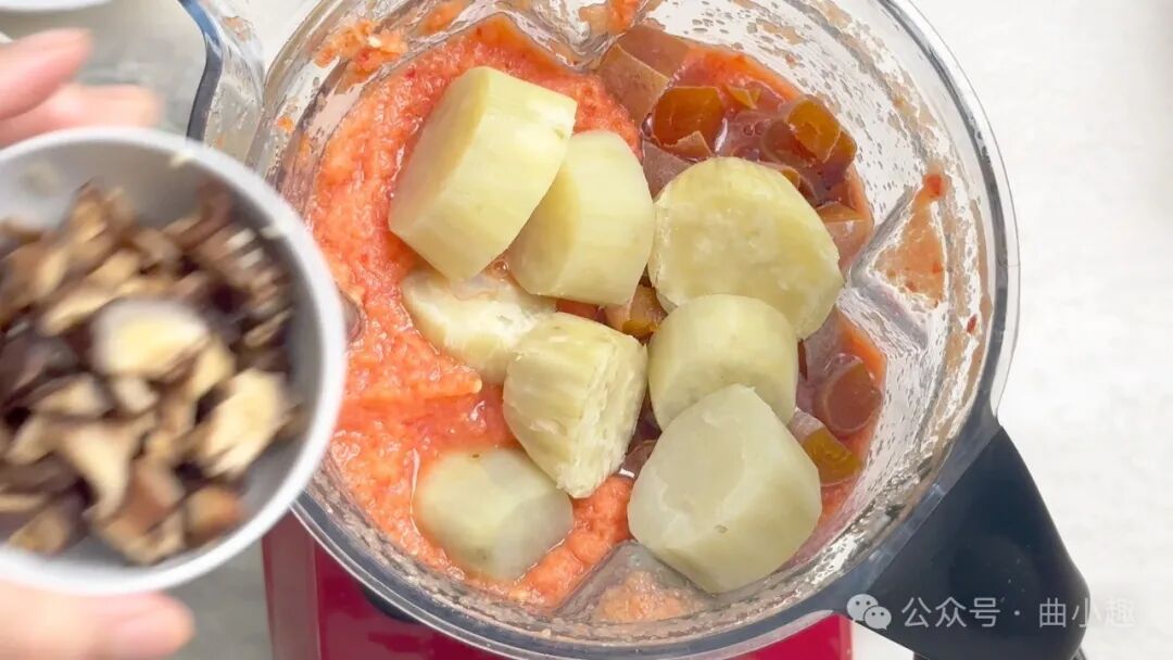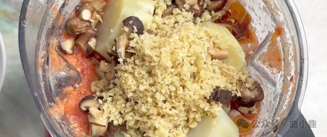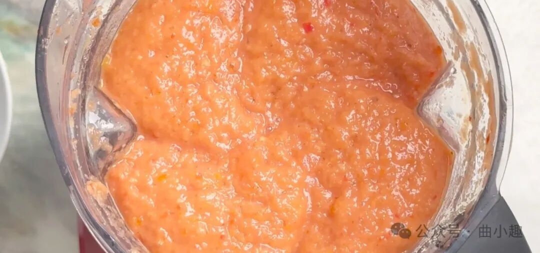 不加水,酱料的块状食材和辣椒一起用料理机打成泥,先放含水量大的苹果、梨、红椒,之后再放其他的食材