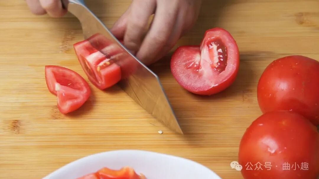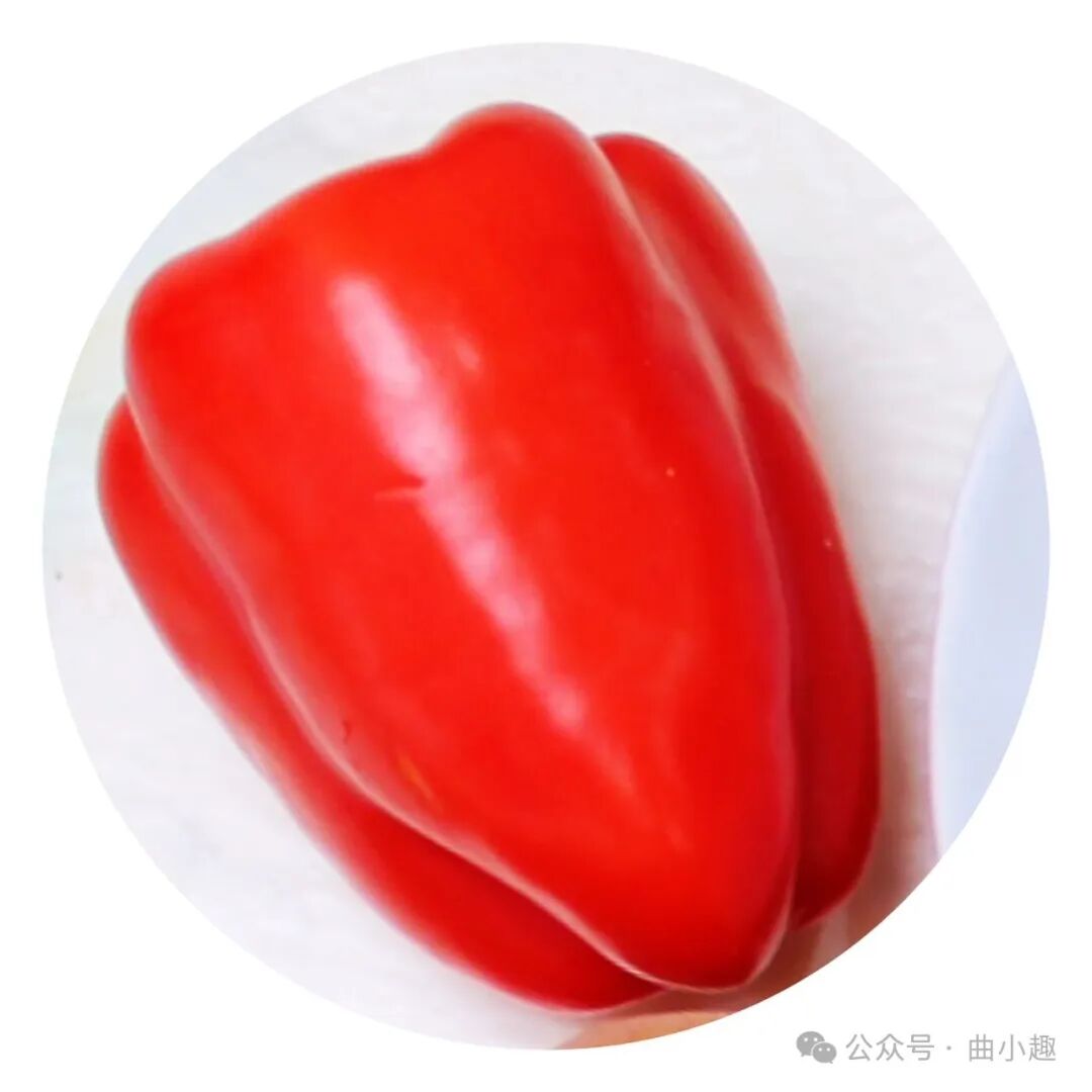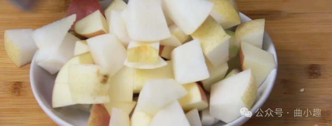 干香菇泡软后焯水切丁,苹果、梨、红甜椒、番茄切块