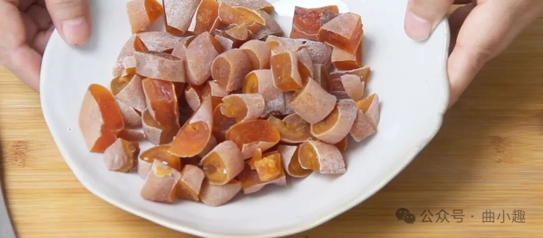 柿饼尽量买软一点的,切块。如果是柿子上市的季节,可用新鲜软柿子的果肉代替(一定要甜柿子,不要涩的)