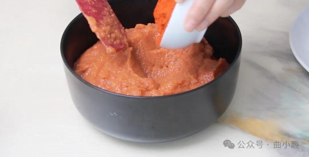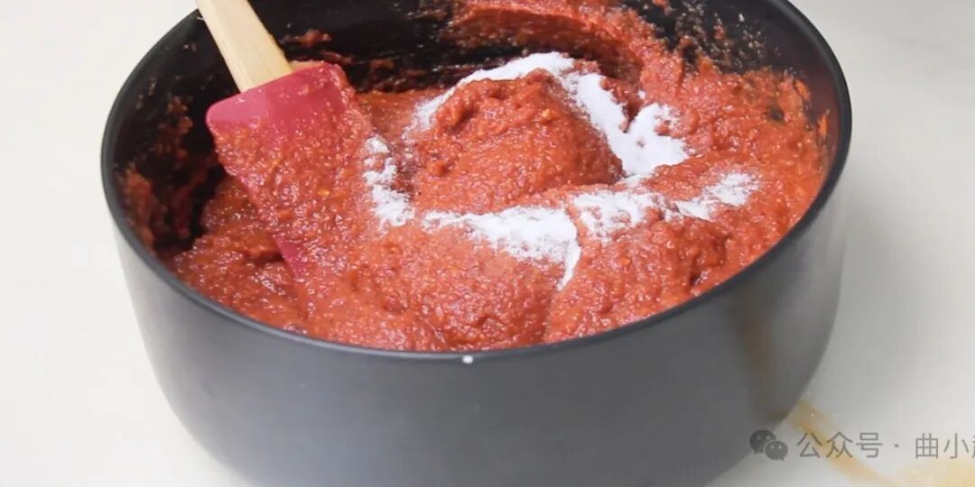 倒入盆中,加入两种辣椒粉、生姜泥,混合制成泡菜酱料,如果生姜碎切的不够细,可与其他食材一起磨碎。最后根据口味加入适量盐,要比正常咸度稍微偏咸一些