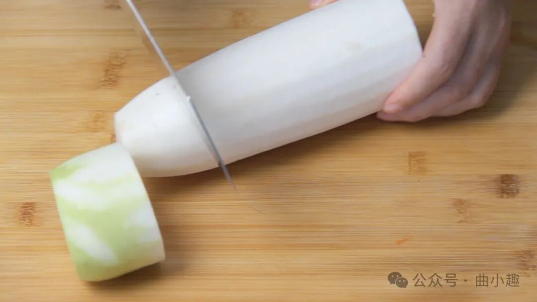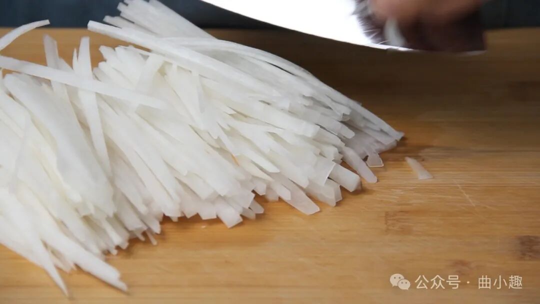 白萝卜中间部分切丝,其它边角料切块打碎做泡菜酱用(如果皮干净,尽量不去皮)