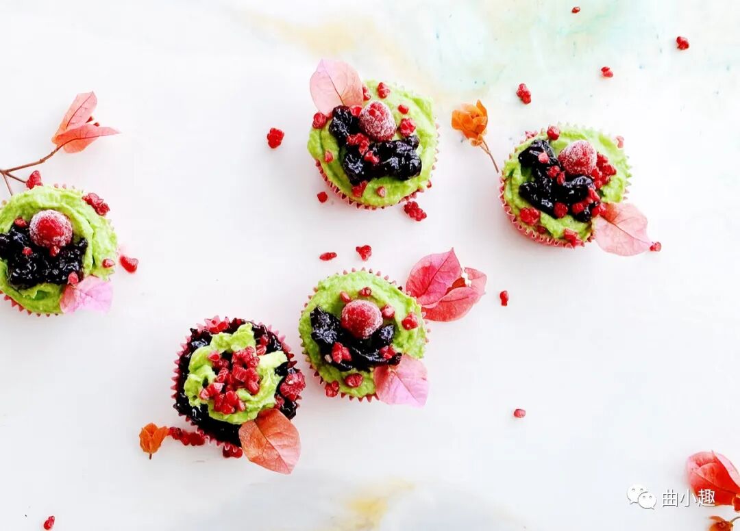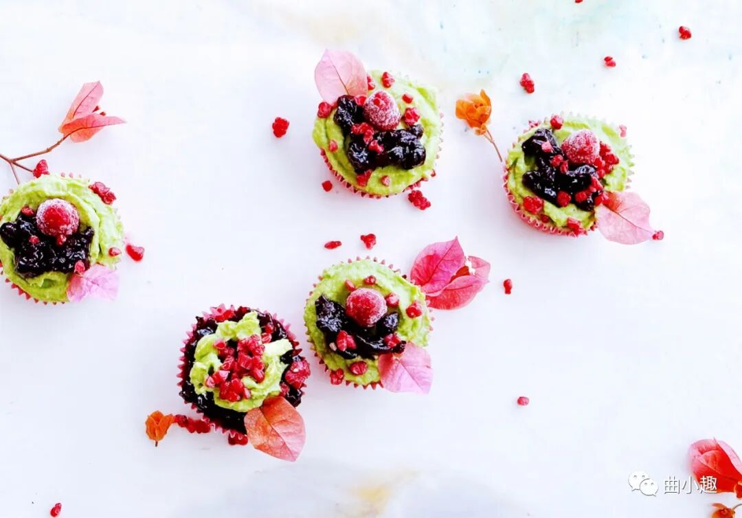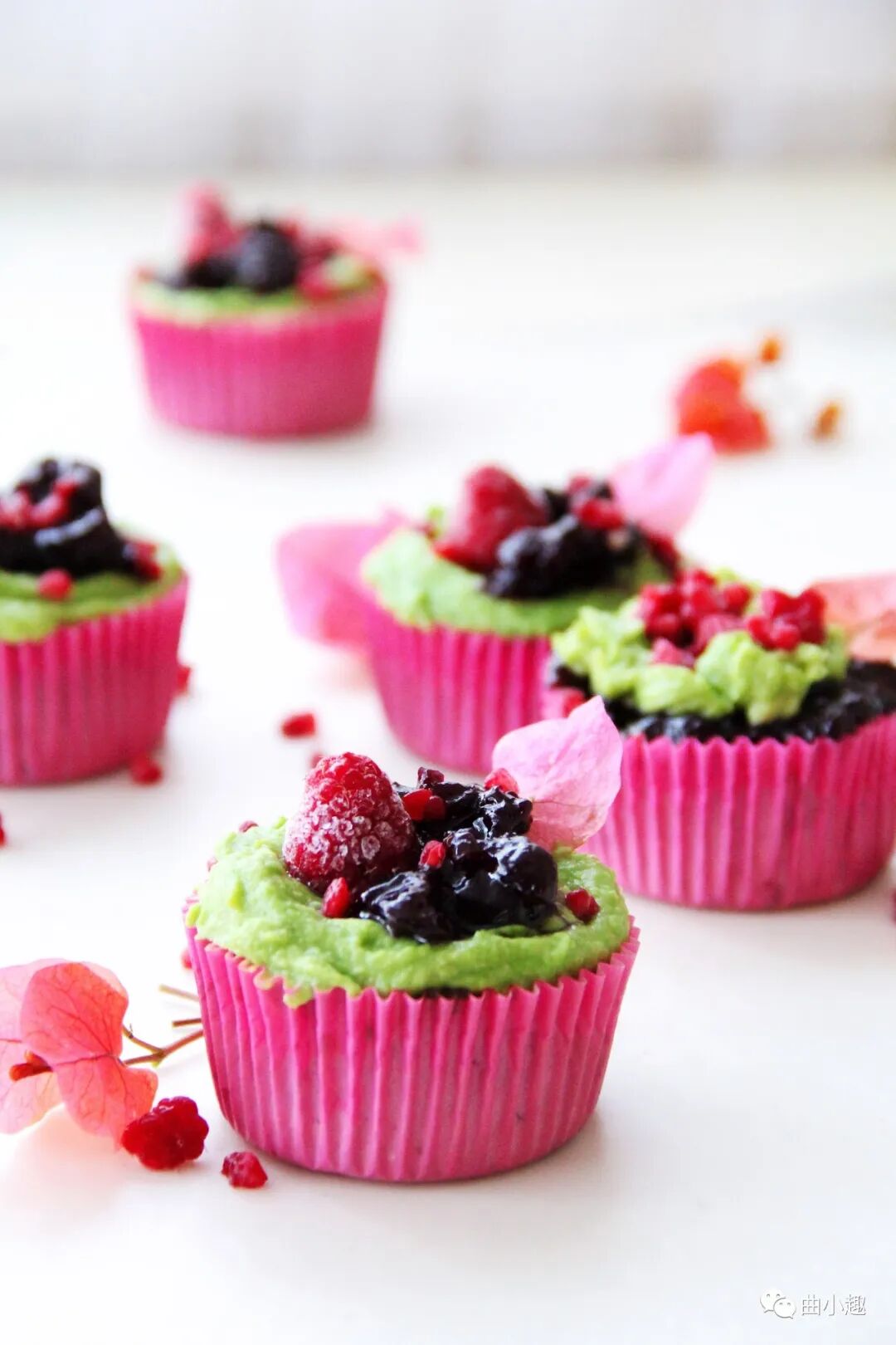 取出玛芬,顶部抹上一层牛油果,再涂抹一层自制蓝莓酱(制作过程参照文末链接),撒上树莓碎,美颜美味的莓果玛芬就做好啦