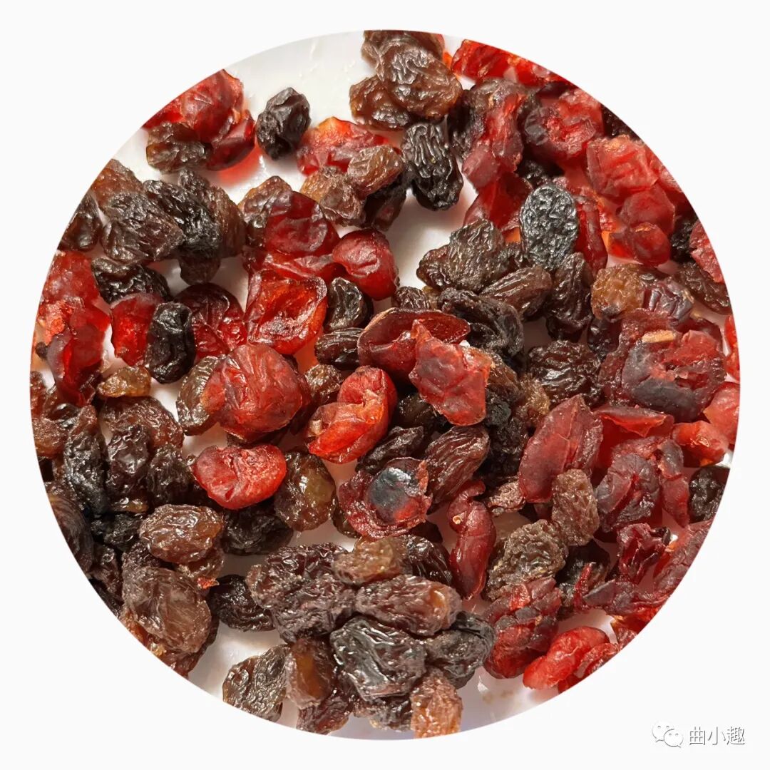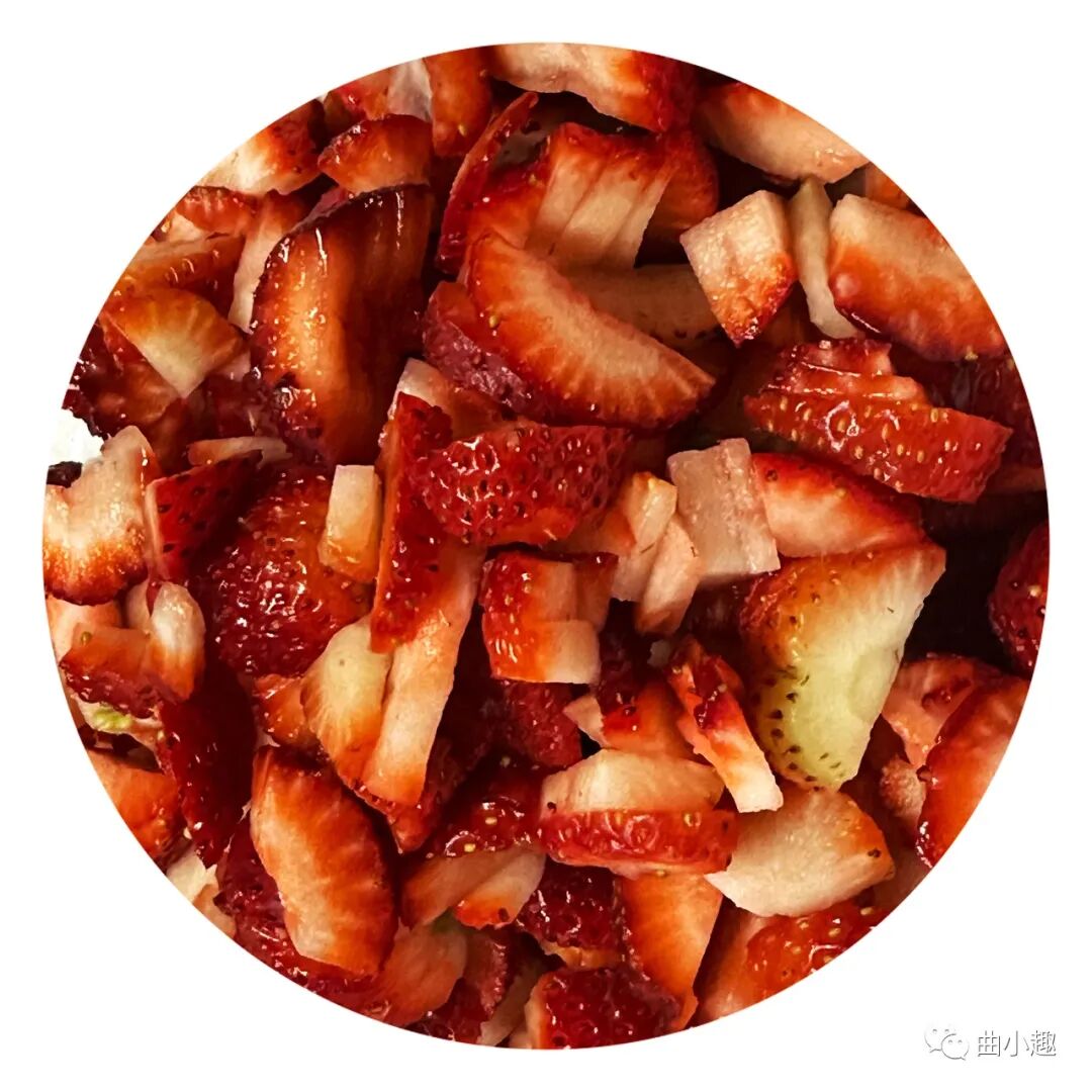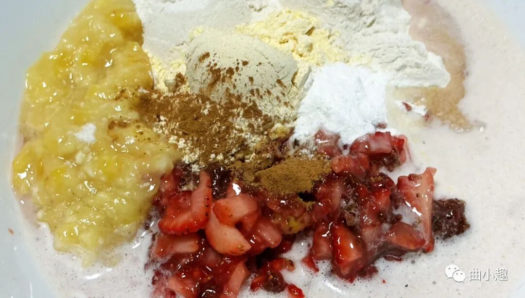 香蕉用叉子压成泥。蔓越莓和葡萄干用料理机打成泥状,与草莓丁混合,用叉子搅拌均匀