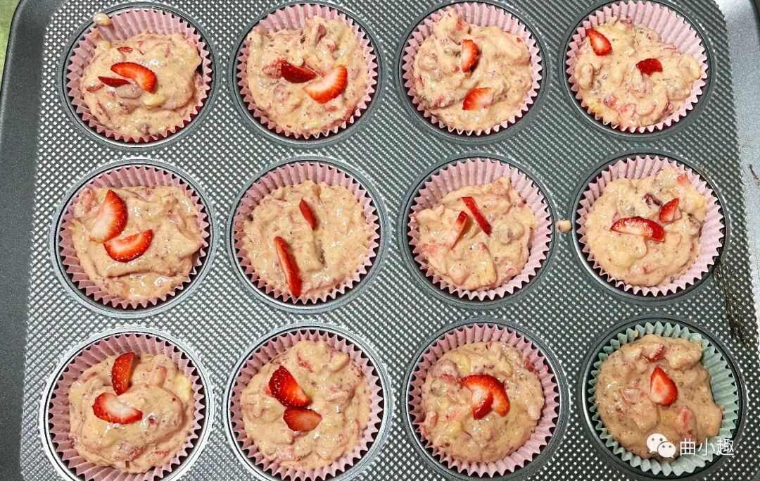 早上从冰箱取出玛芬面糊,倒入烤盘的纸杯中,约7-8分满即可。烤箱预热190度,然后放进玛芬烤盘,根据自己的烤箱,约20-25分钟,牙签插进去不沾,即可取出